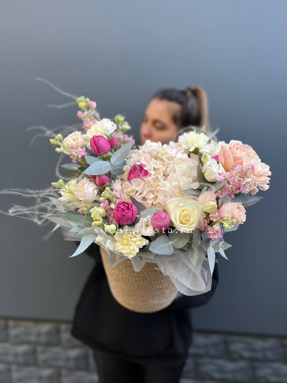 Воздушная гортензия окружает розы пудровых и снежных оттенков, а эвкалипт добавляет глубину и свежесть. Композиция собрана в натуральное джутовое кашпо, которое удобно разместить на столе или подоконнике.