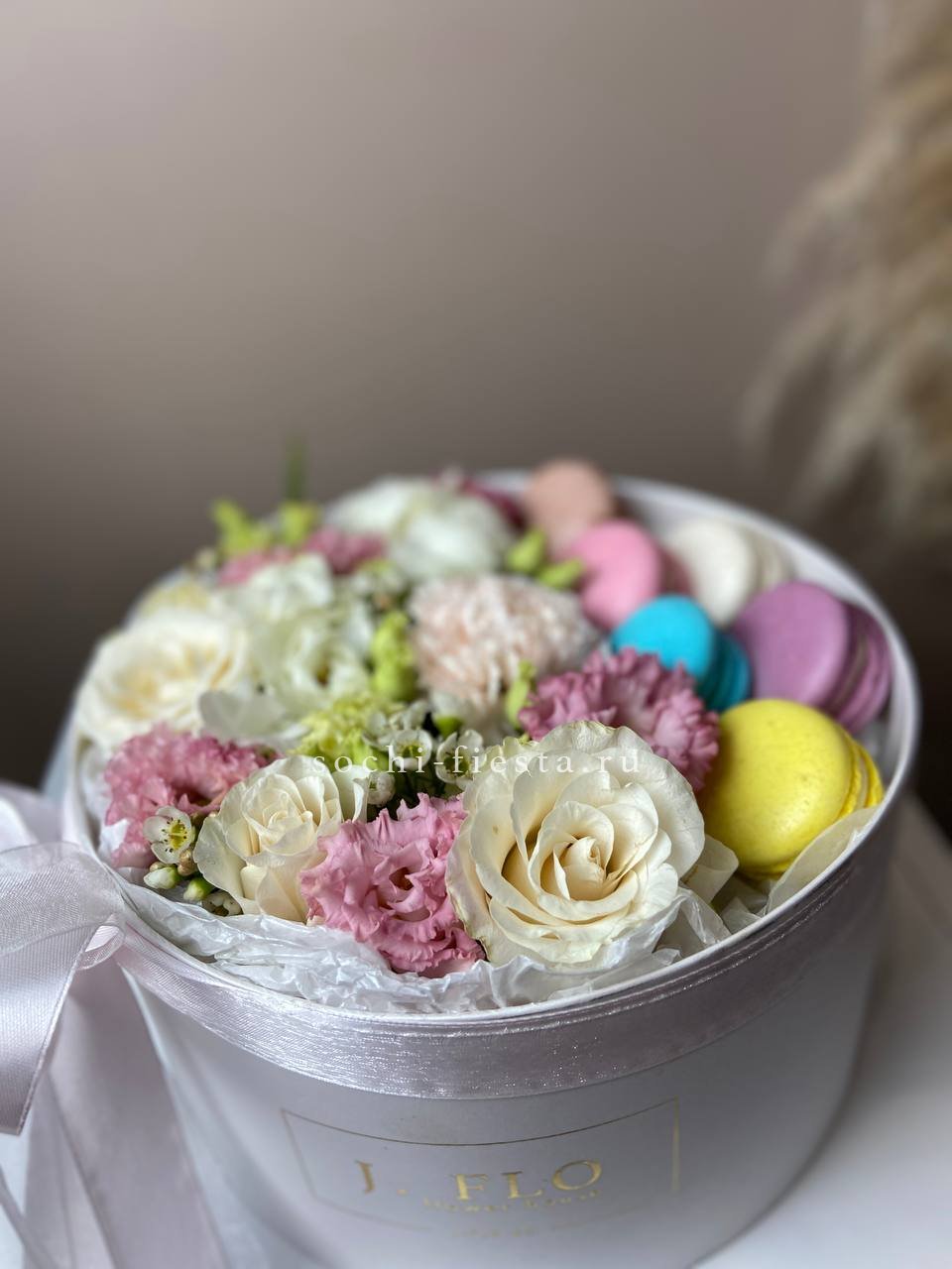 Белые розы в круглом боксе дополнены яркими альстромериями и шестью воздушными макаронс. Композиция собрана плотно и выглядит свежо в любом интерьере.