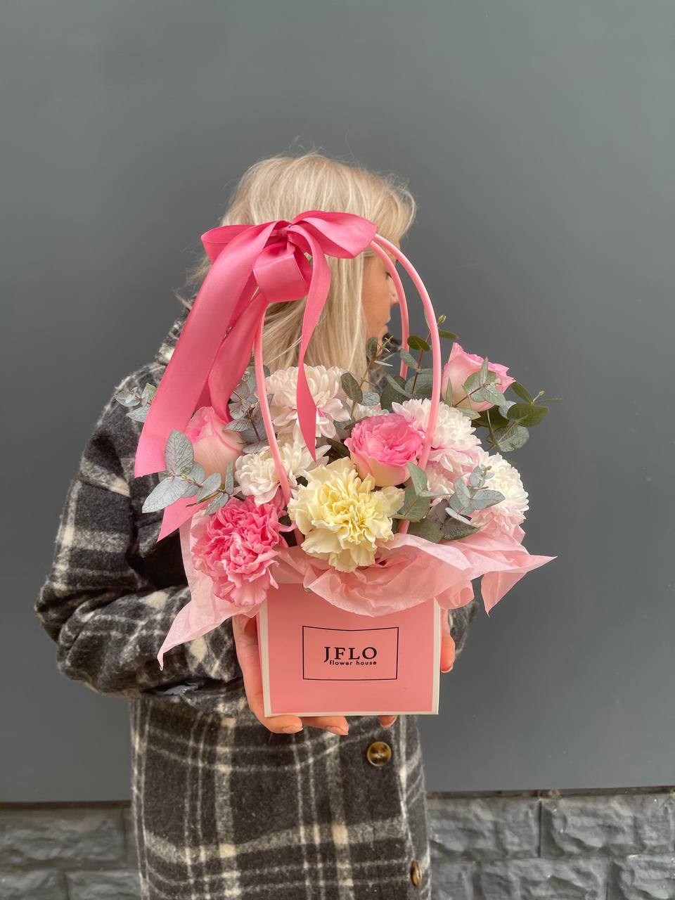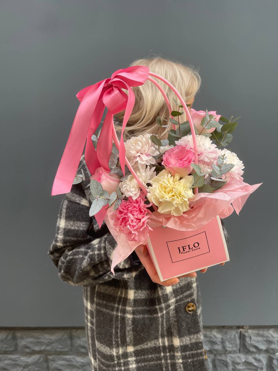 Весенняя композиция в миниатюрной сумочке собрана из хризантем, роз и пушистых веток вербы. Хлопок добавляет мягкости, а эвкалипт освежает общую картину. Компактная форма позволяет разместить её на столе или комоде.