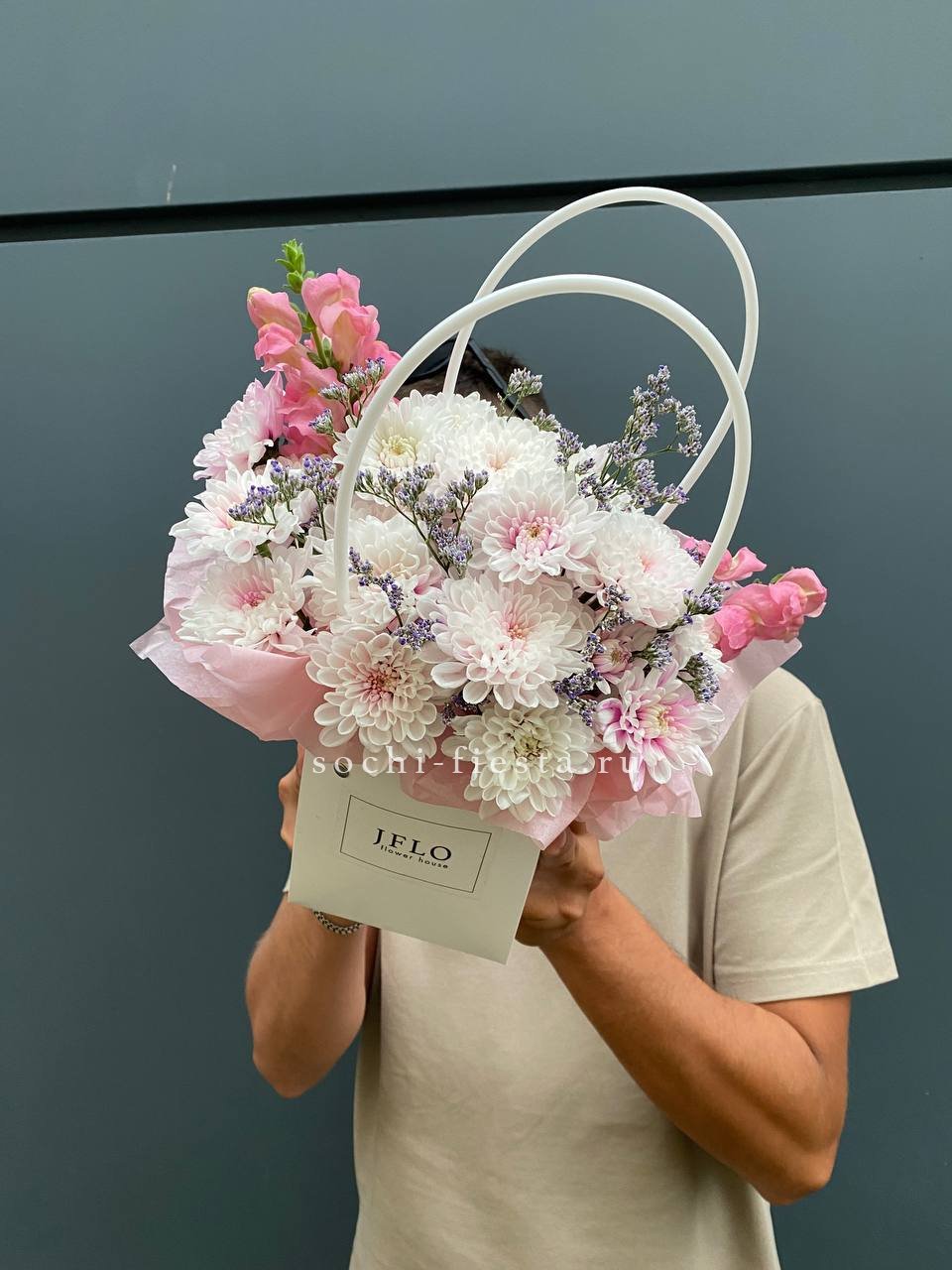 Хризантемы и львиный зев собраны в удобную сумочку с плотной структурой. Лимониум добавляет воздушности между яркими соцветиями. Композиция сохраняет свежесть долго и не требует особого ухода.