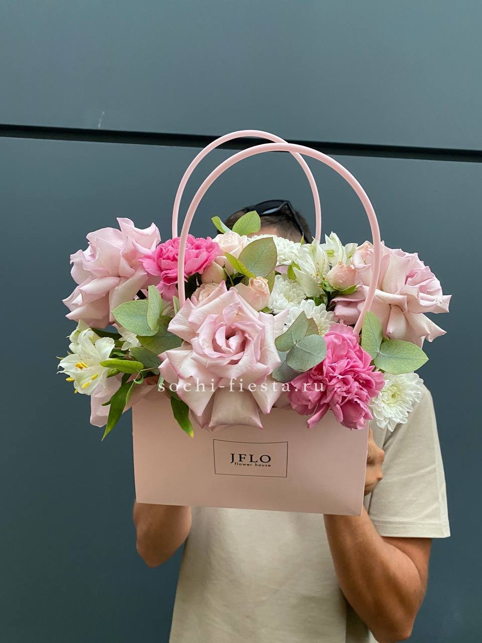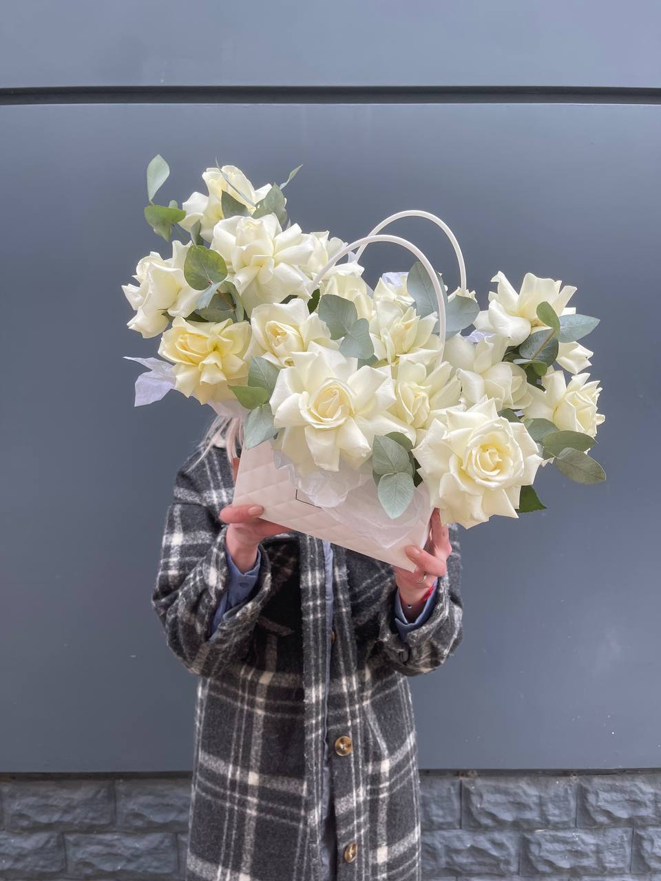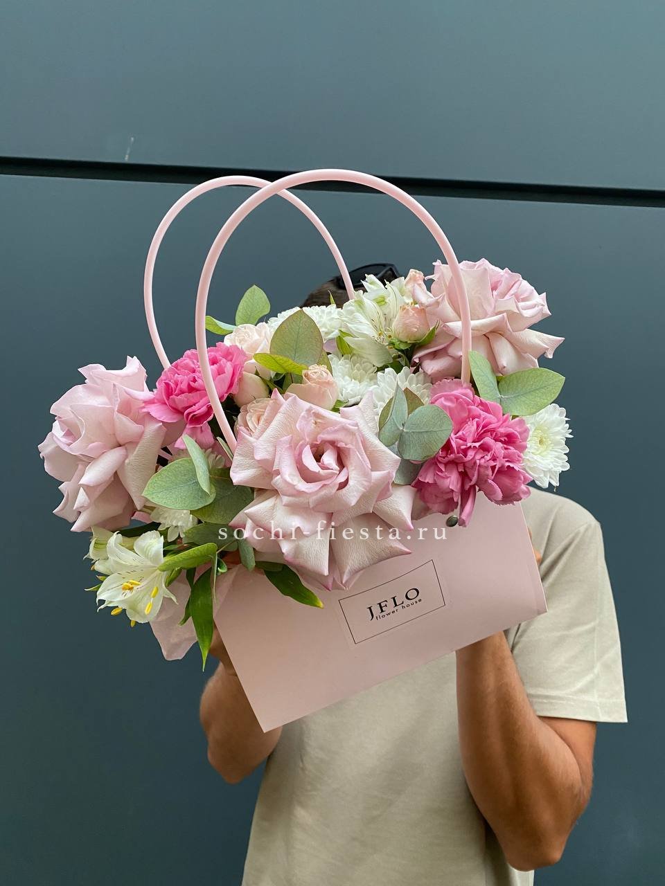 Хризантемы с пушистыми коробочками хлопка создают теплую домашнюю композицию в удобной сумочке. Цветы долго радуют взгляд и не требуют сложного ухода. Формат подходит для размещения в любом уголке дома.