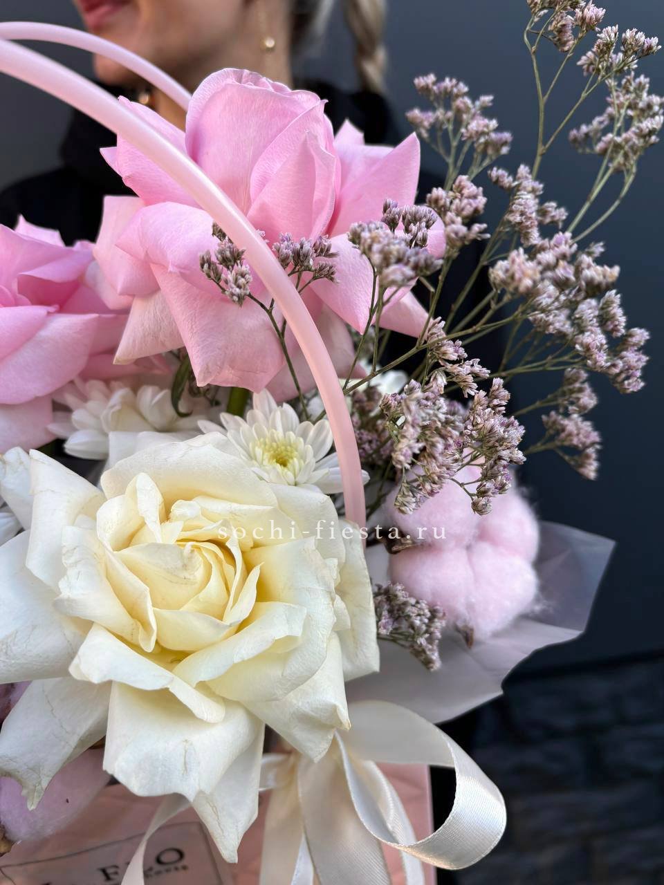 Розовые розы и диантусы переплетаются с кустовыми хризантемами в плотной округлой композиции. Альстромерия добавляет графичные акценты между бутонами. Сумочка собирает все элементы в аккуратную форму с естественным объёмом.