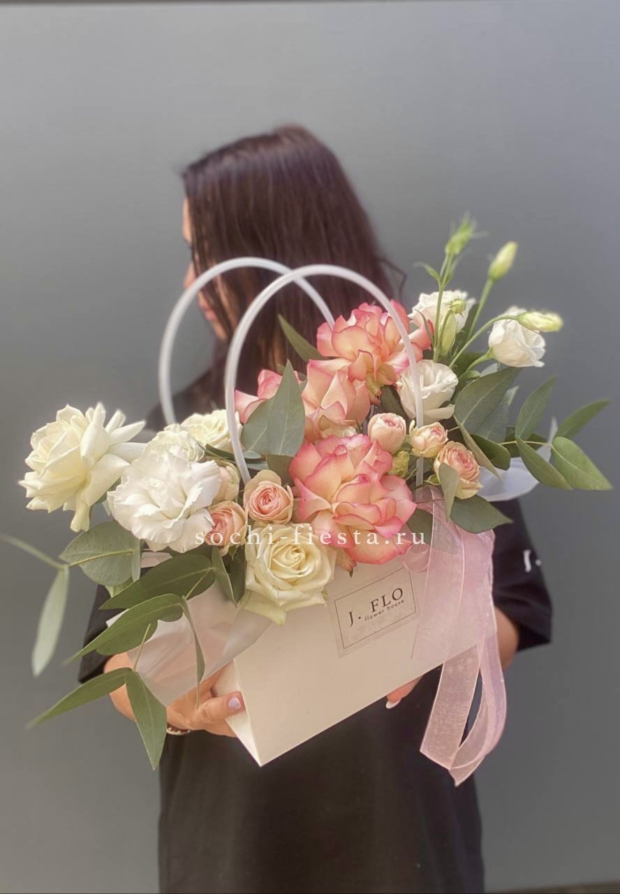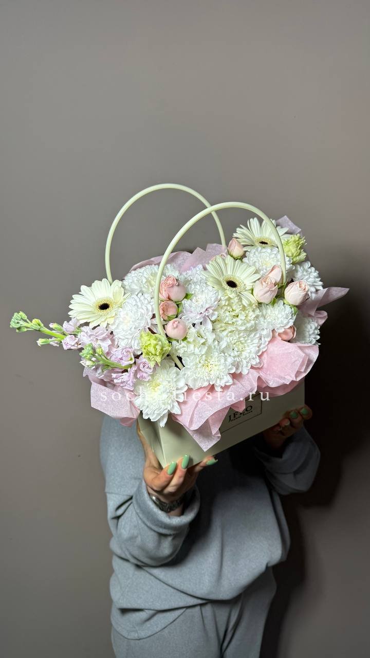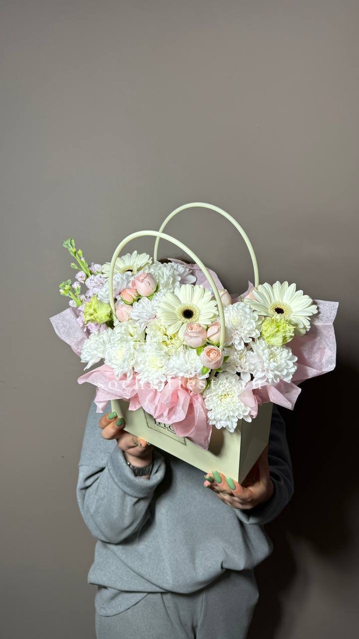 Гортензия создает объемную базу, а герберы и кустовые розы добавляют яркие акценты по всей композиции. Эвкалипт обрамляет сумочку легкими серебристыми ветвями.