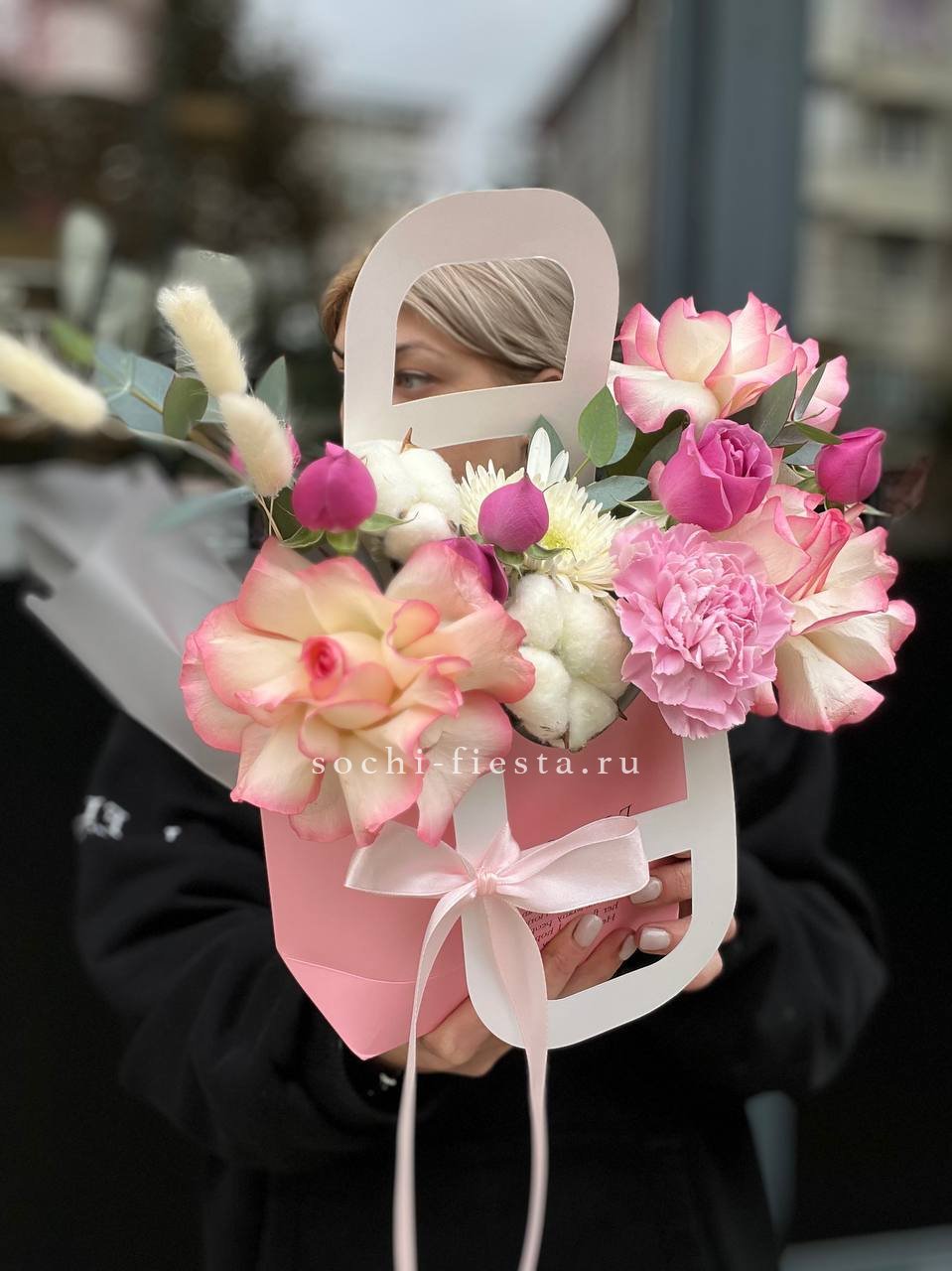 джумилия, гербера, мисти баблс, диантус, хлопок, лагурус, сумочка.