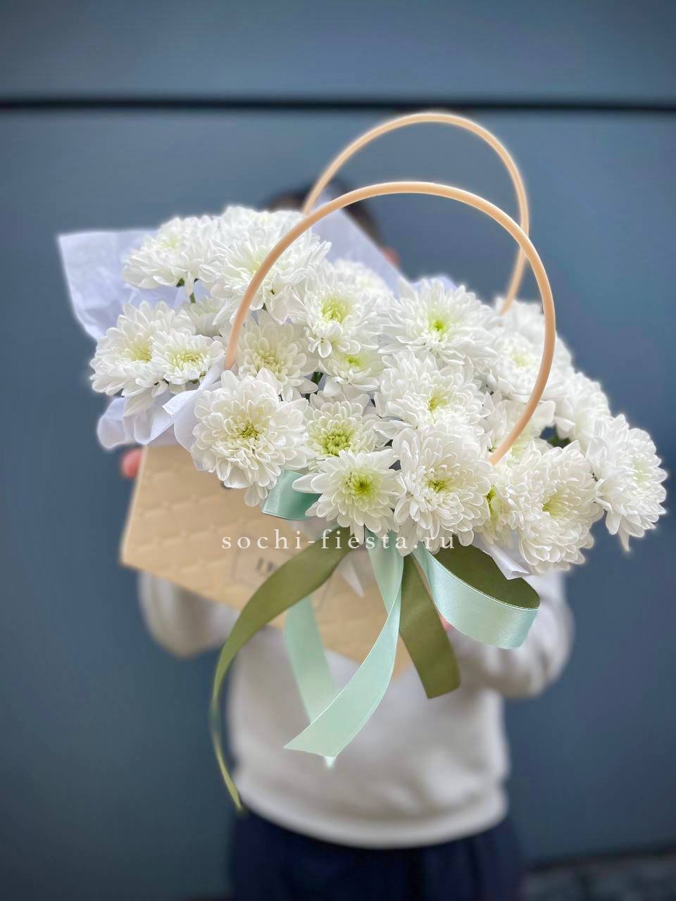 Компактная сумочка с кустовыми хризантемами создаёт уютное настроение. Живые соцветия собраны в удобной форме, которая легко размещается на столе или полке.