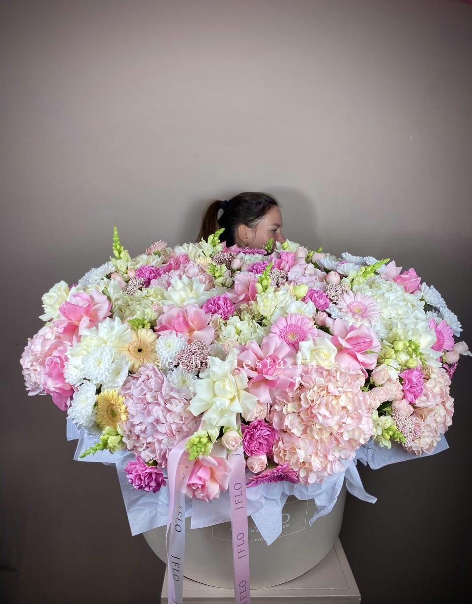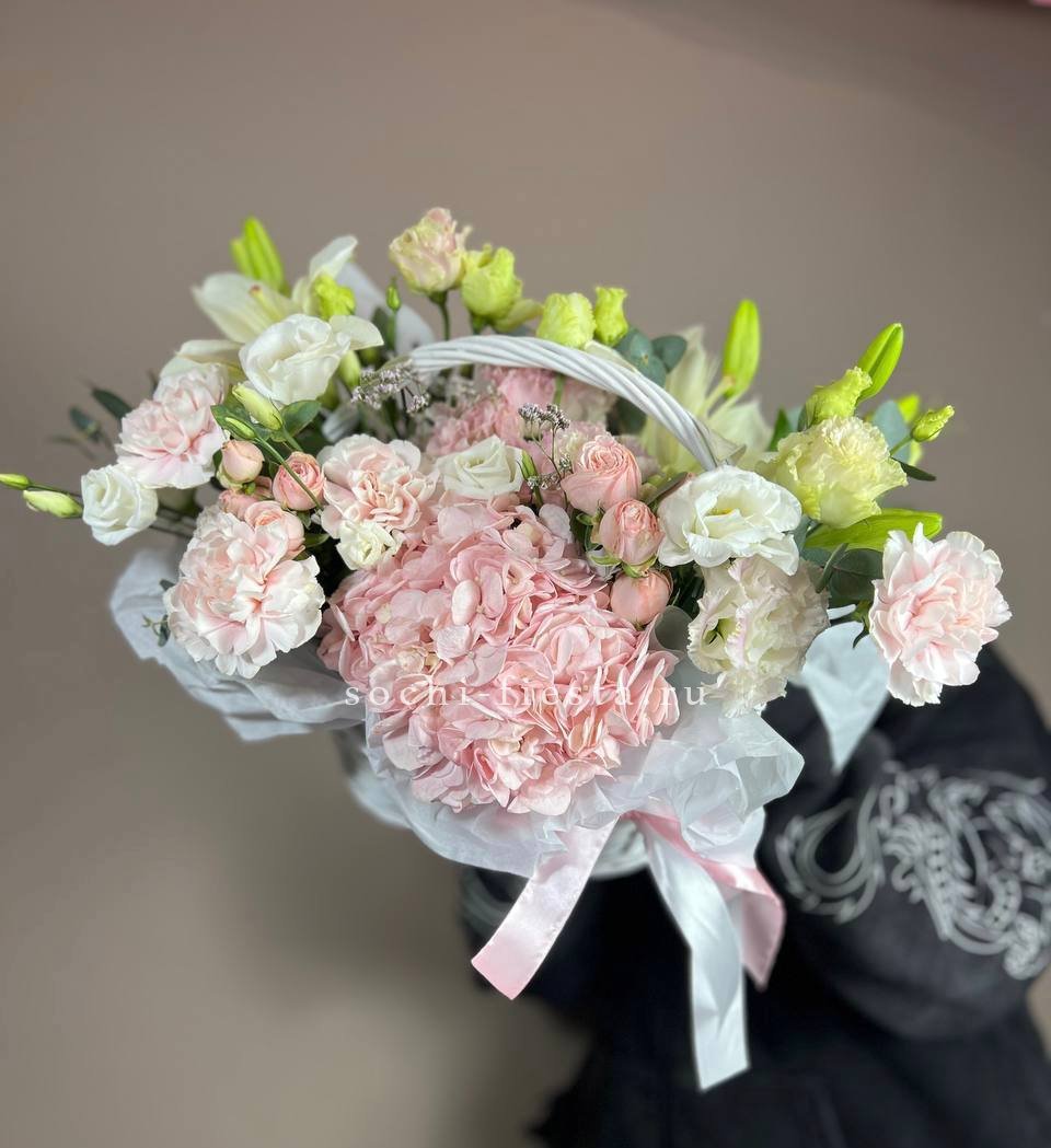 Корзина объединяет гортензии, эустомы, розы и маттиолу в многослойную композицию. Разные фактуры лепестков создают визуальную глубину и насыщенность.