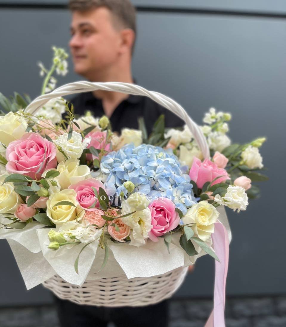 гортензия нежно-розовых оттенков, эустома, лилии, диантус, кустовая роза, эвкалипт, вспомогательная зелень, лента, светлая корзина.