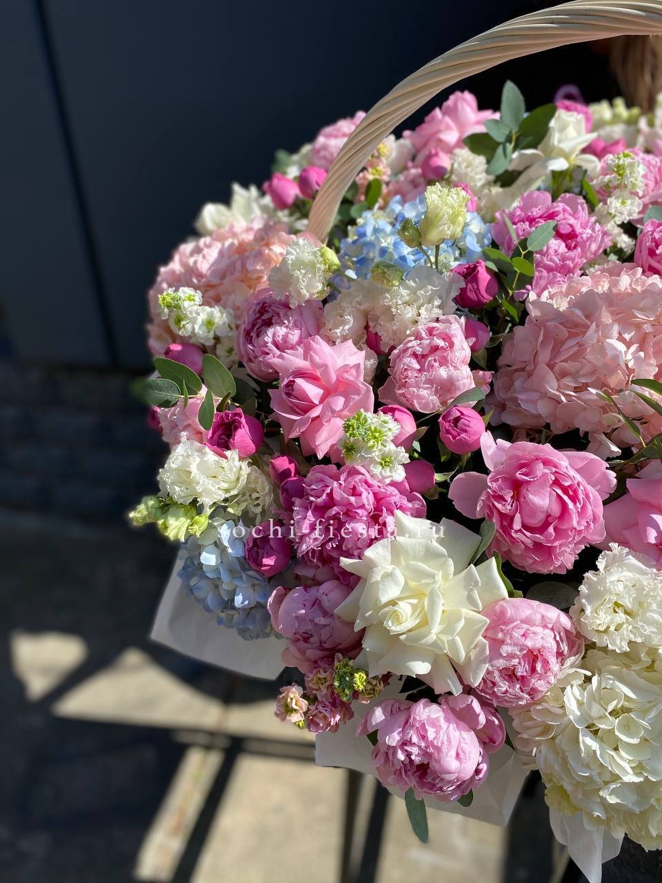 Цветочная корзина из пионов и пионовидных роз "Перфекте"