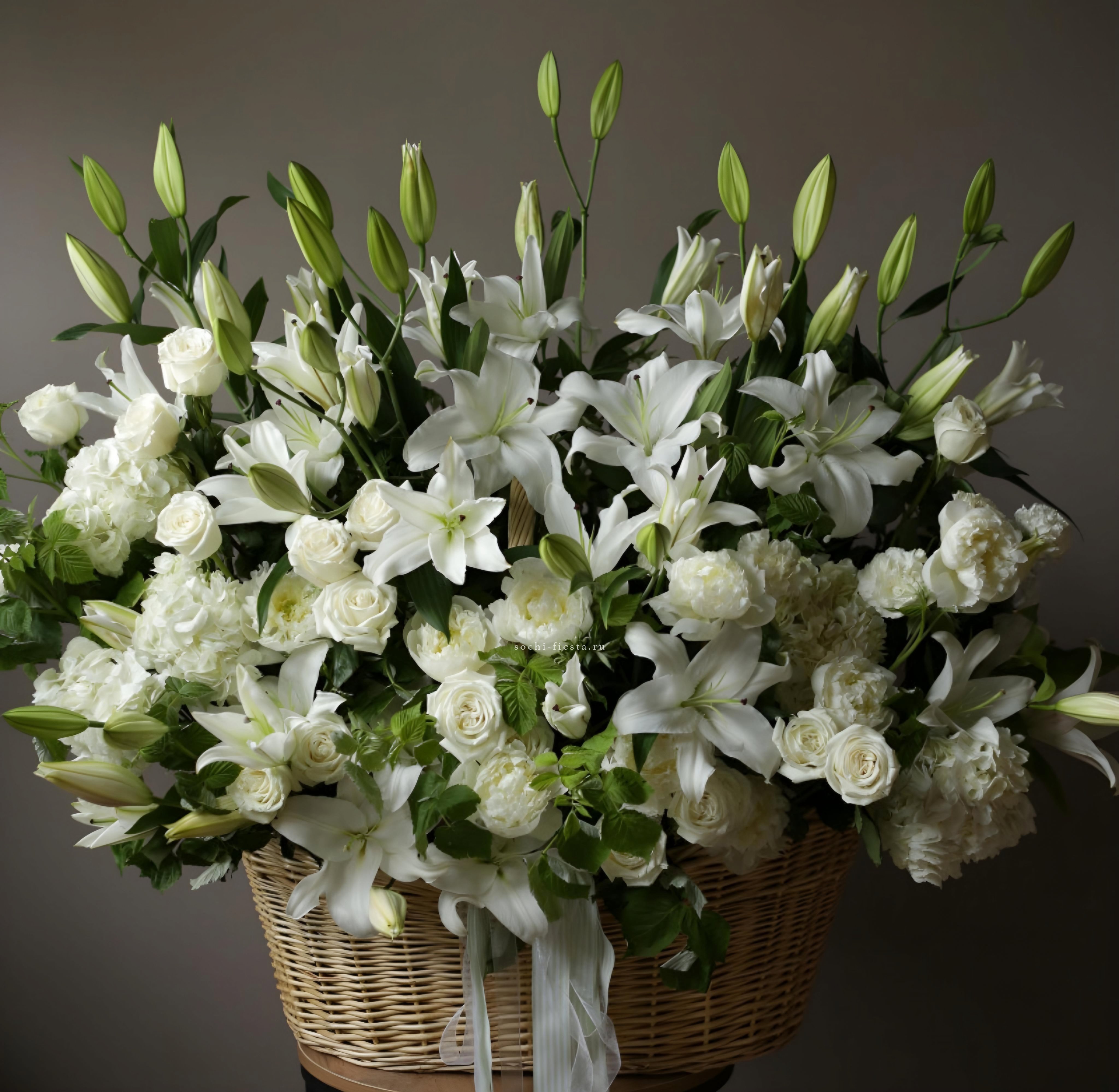 пионы, кустовая пионовидная роза, маттиола, пиафлор, плетеный бокс или корзина D40 В низкий сезон (с сентября - по апрель) пионы, находящиеся в составе данной композиции, могут быть заменены на пионовидную розу по согласованию с заказчиком.