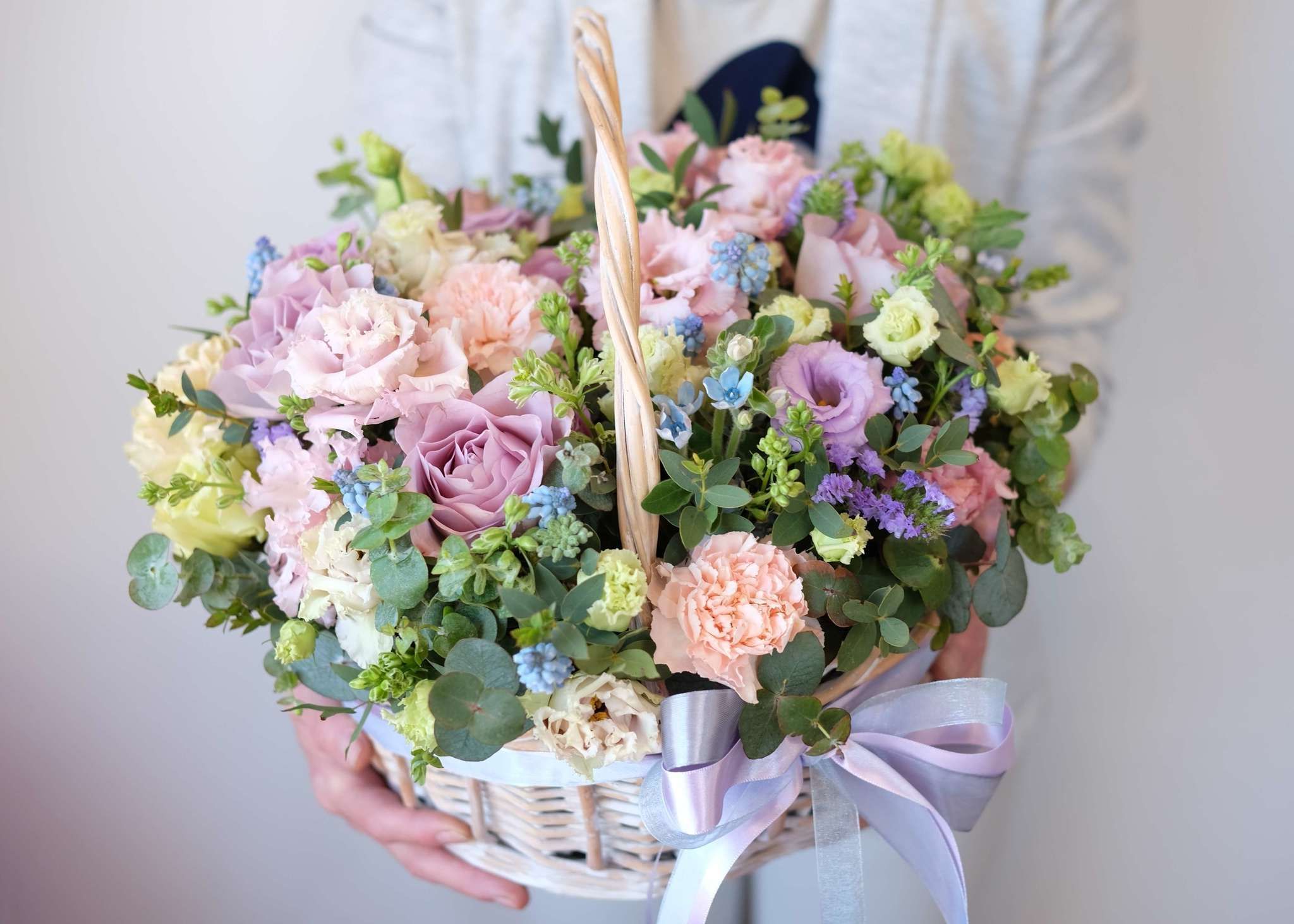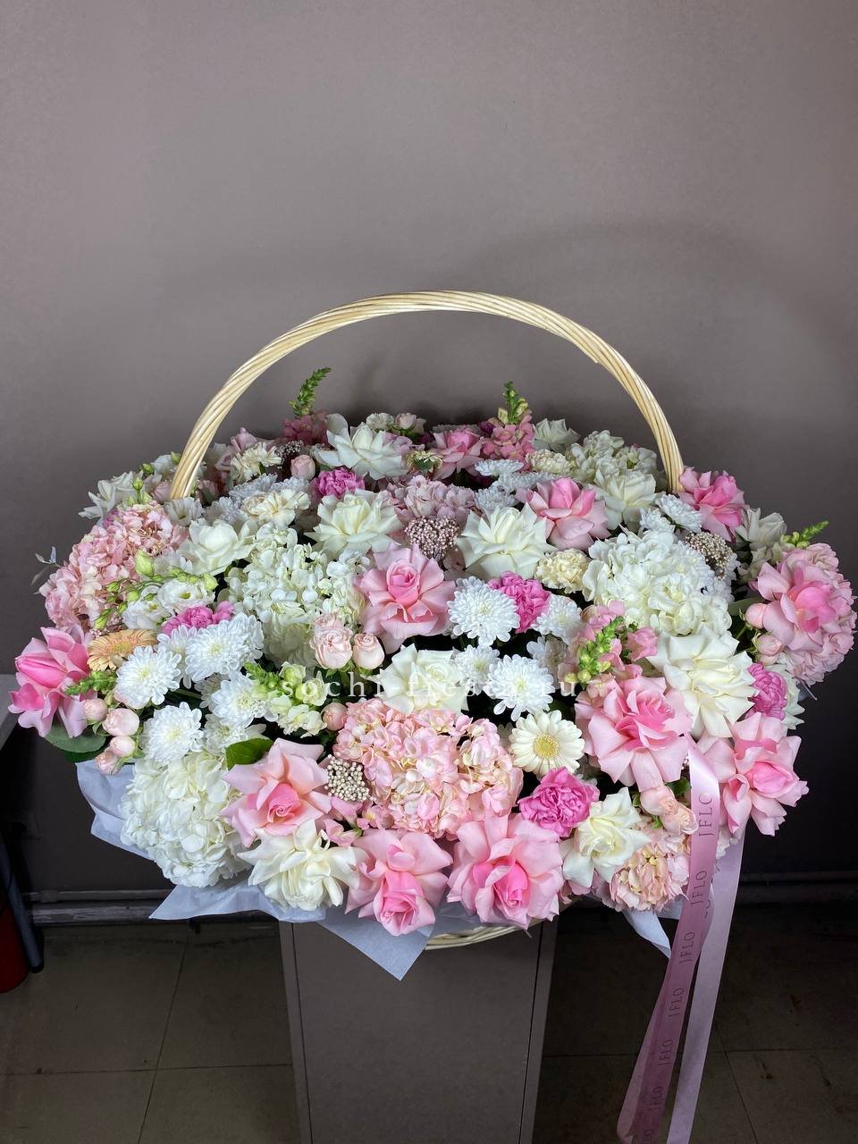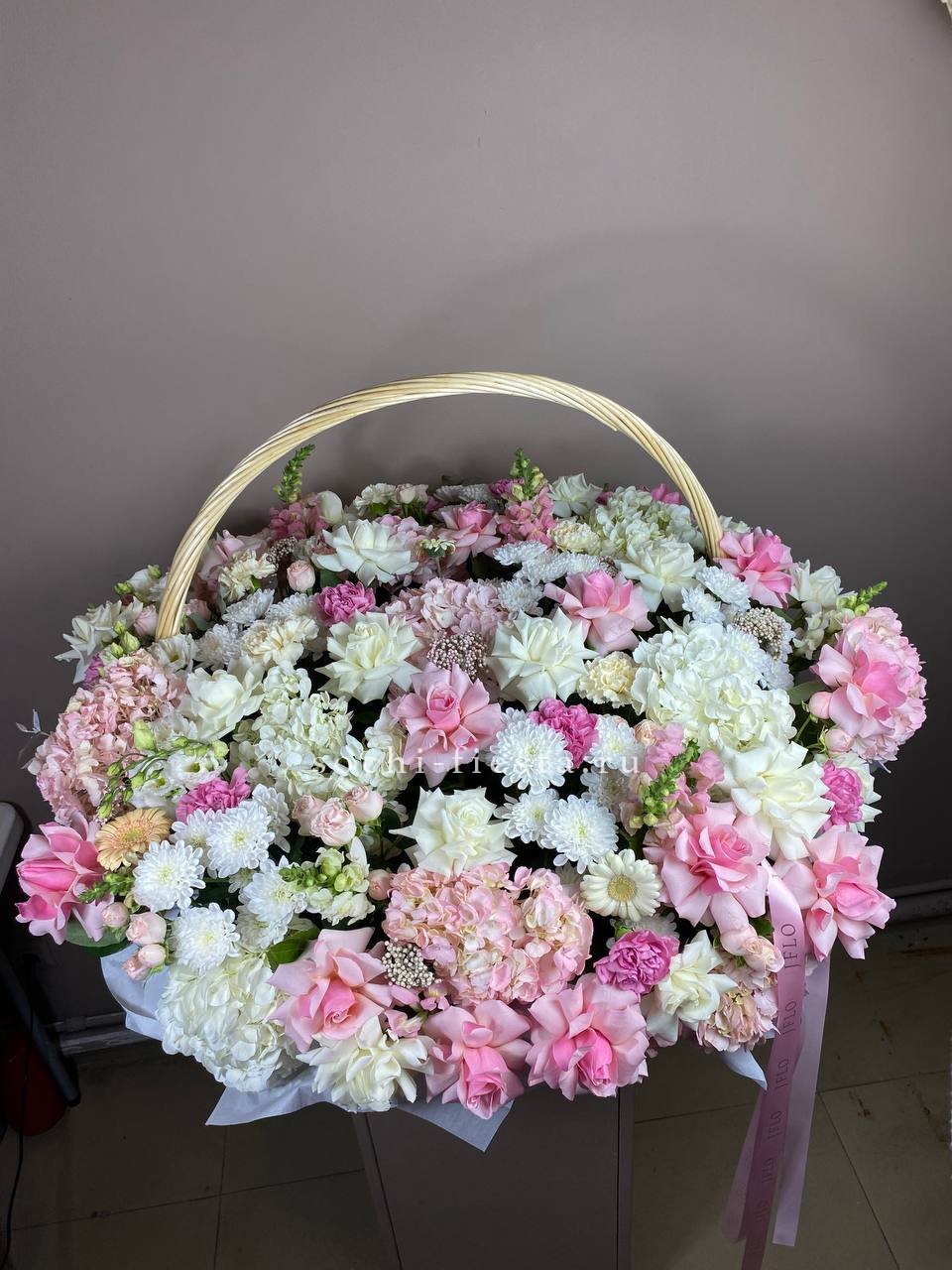 Плетёная корзина вмещает густую композицию из белых и розовых бутонов. Хризантемы и розы перемежаются с соцветиями гортензии, а статица добавляет воздушности между крупными головками цветов.