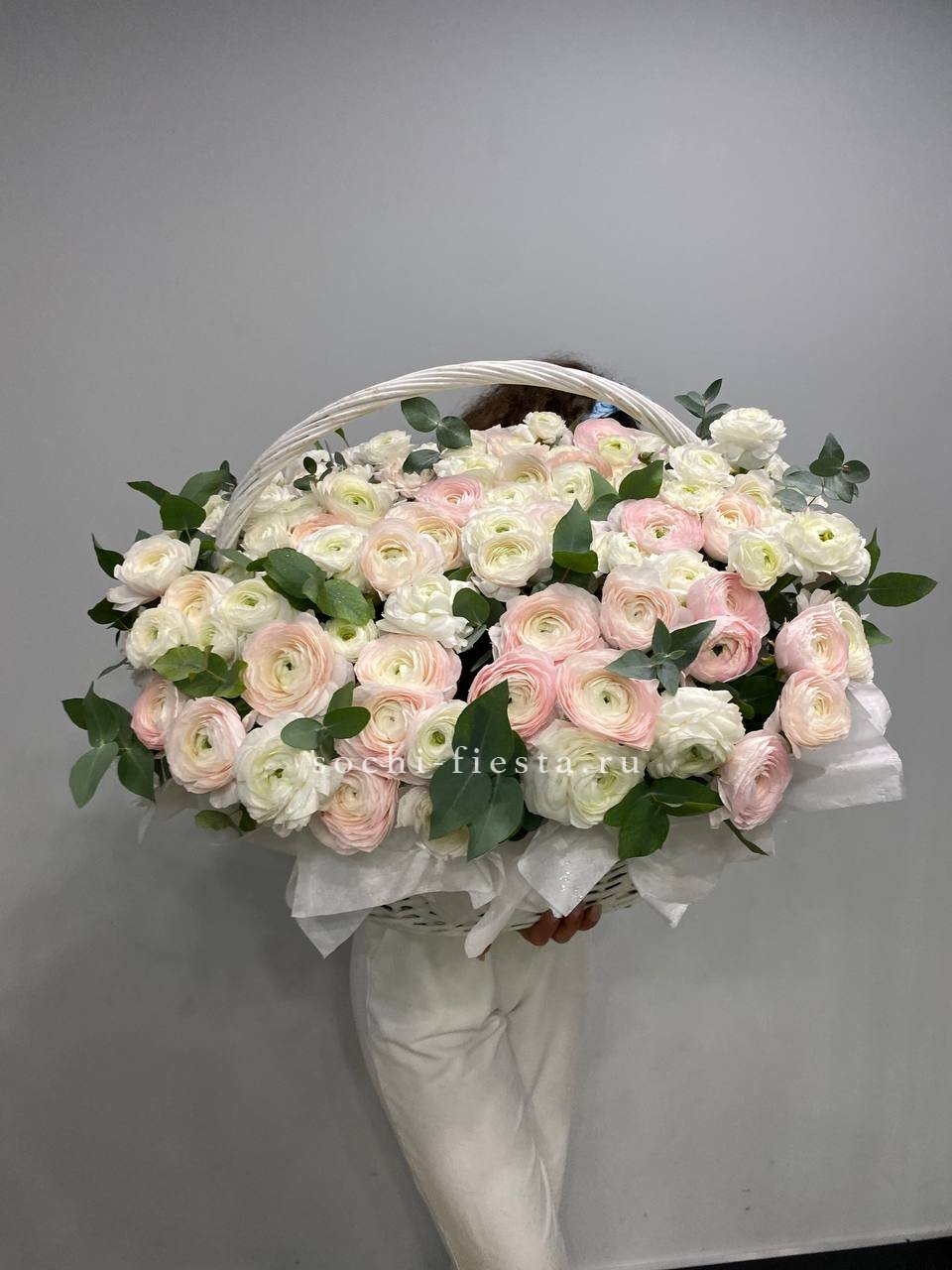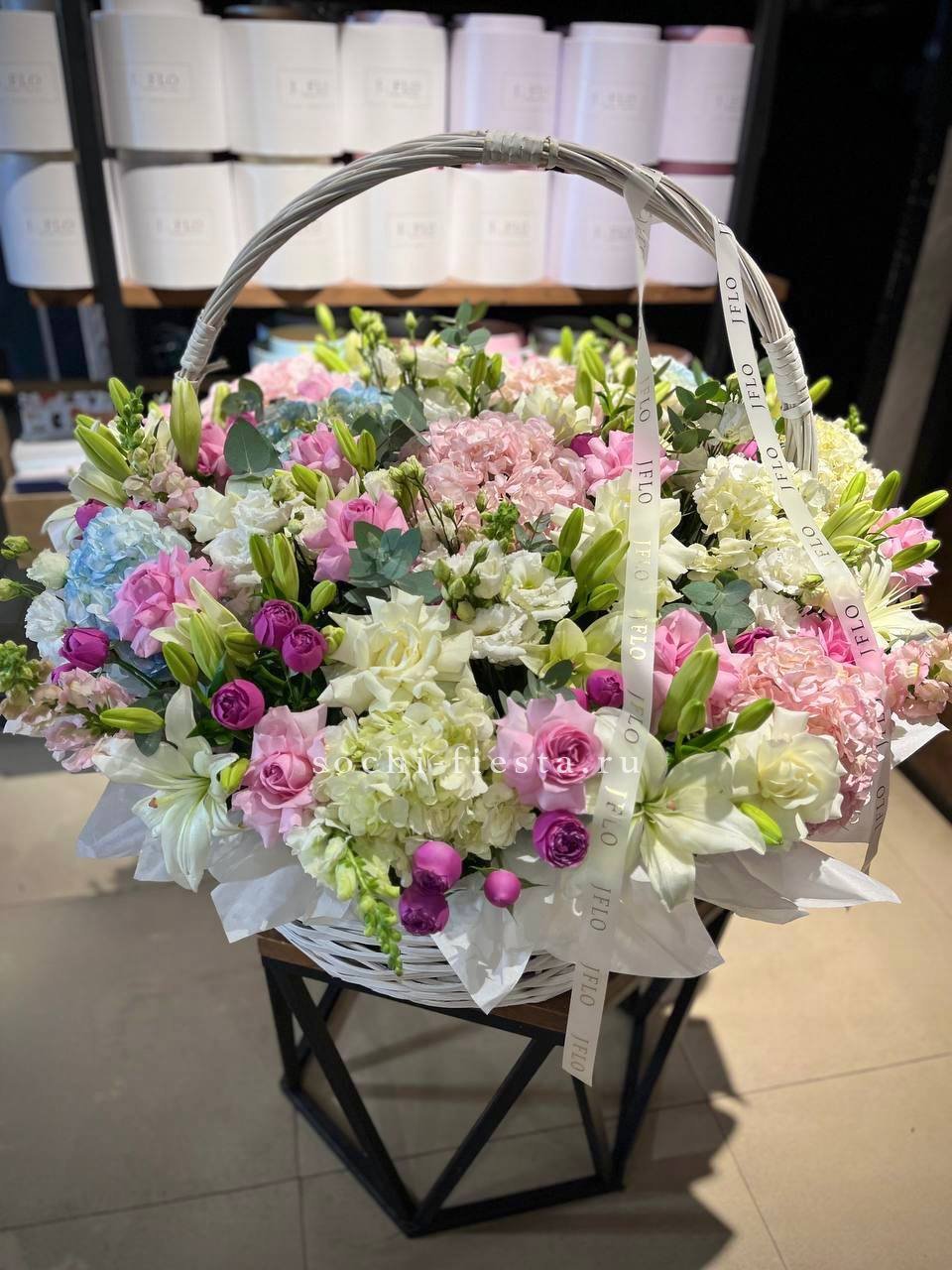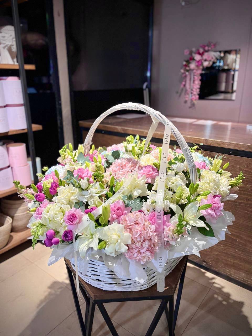 Корзина собрана плотно, каждый цветок находит своё место в общей композиции.
