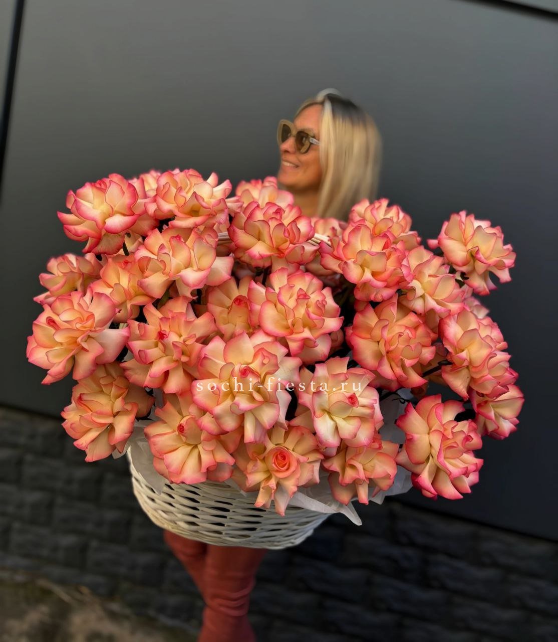 Монументальная композиция из полутора сотен белоснежных бутонов создает впечатление цветочного облака. Корзина придает устойчивость и завершенность форме, позволяя разместить такой масштабный ансамбль в любом пространстве.