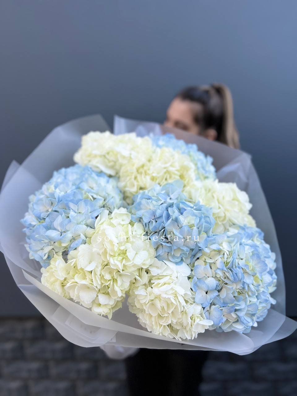 гортензия розовая 9шт., лента, дизайнерская упаковка. Цвет гортензий может незначительно отличаться.