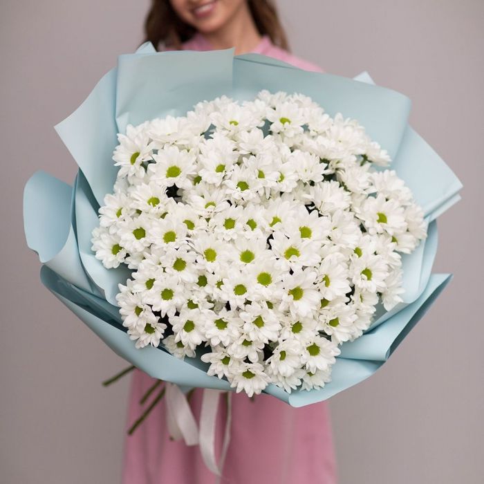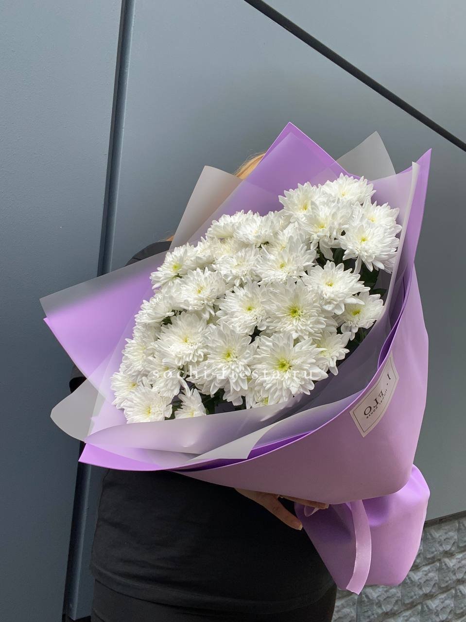 Семь веток кустовой хризантемы обрамлены лавандовым фоамираном, который мягко перекликается с оттенками бутонов. Композиция собрана свободно, сохраняя естественную пластику стеблей и живость форм.