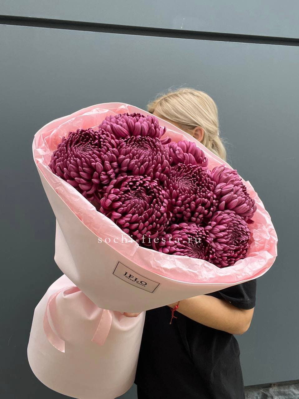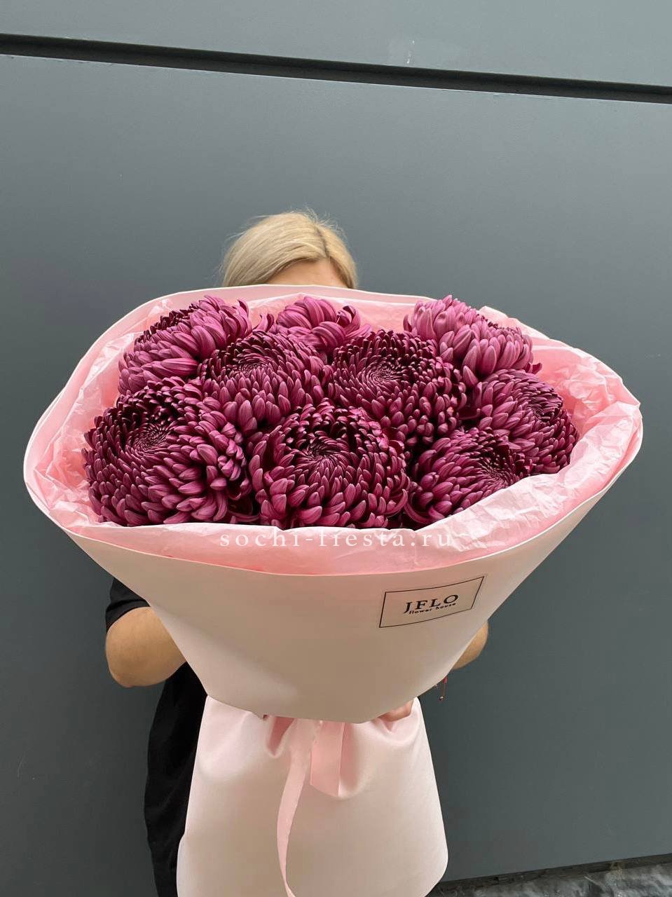 Девять хризантем бигуди выстраиваются в воздушную композицию с игольчатыми лепестками. Каждый бутон раскрывается лучистой звездой, создавая объёмную фактуру и динамичный силуэт.