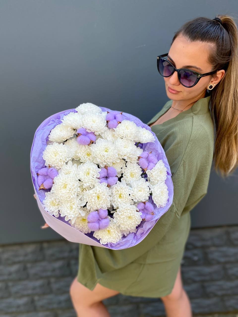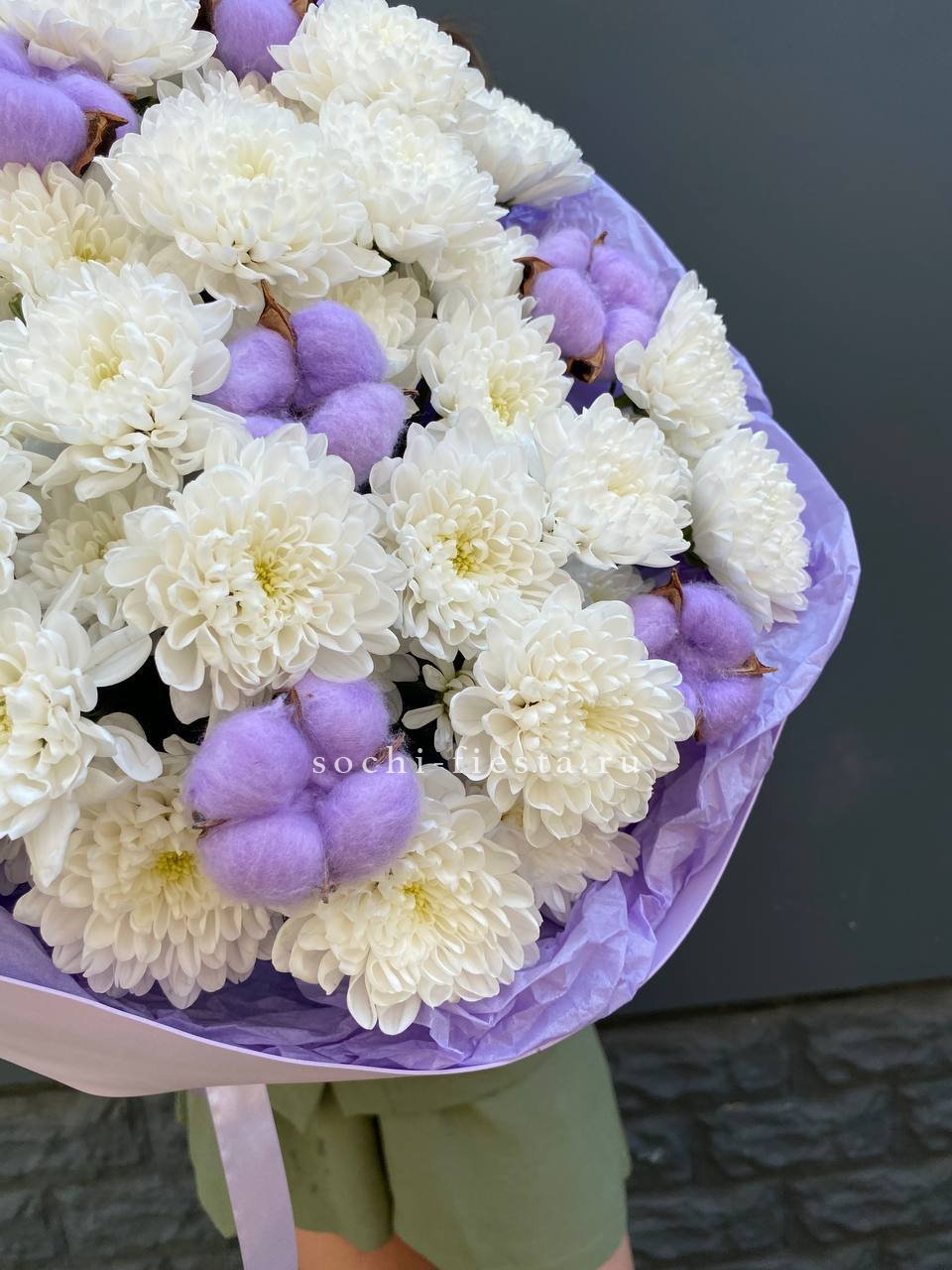 хризантема кустовая - 17 веток, тишью, дизайнерская упаковка, лента.