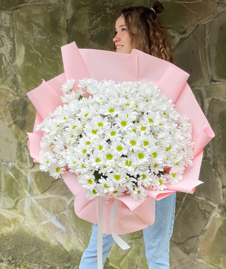 Семь крупных хризантем с открытыми бутонами в дизайнерской упаковке. Букет выглядит свежо и современно, легко вписывается в любое пространство.