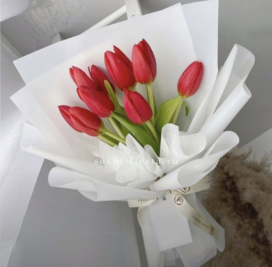 7 белых тюльпанов, лента, крафт, вспомогательное оформление.