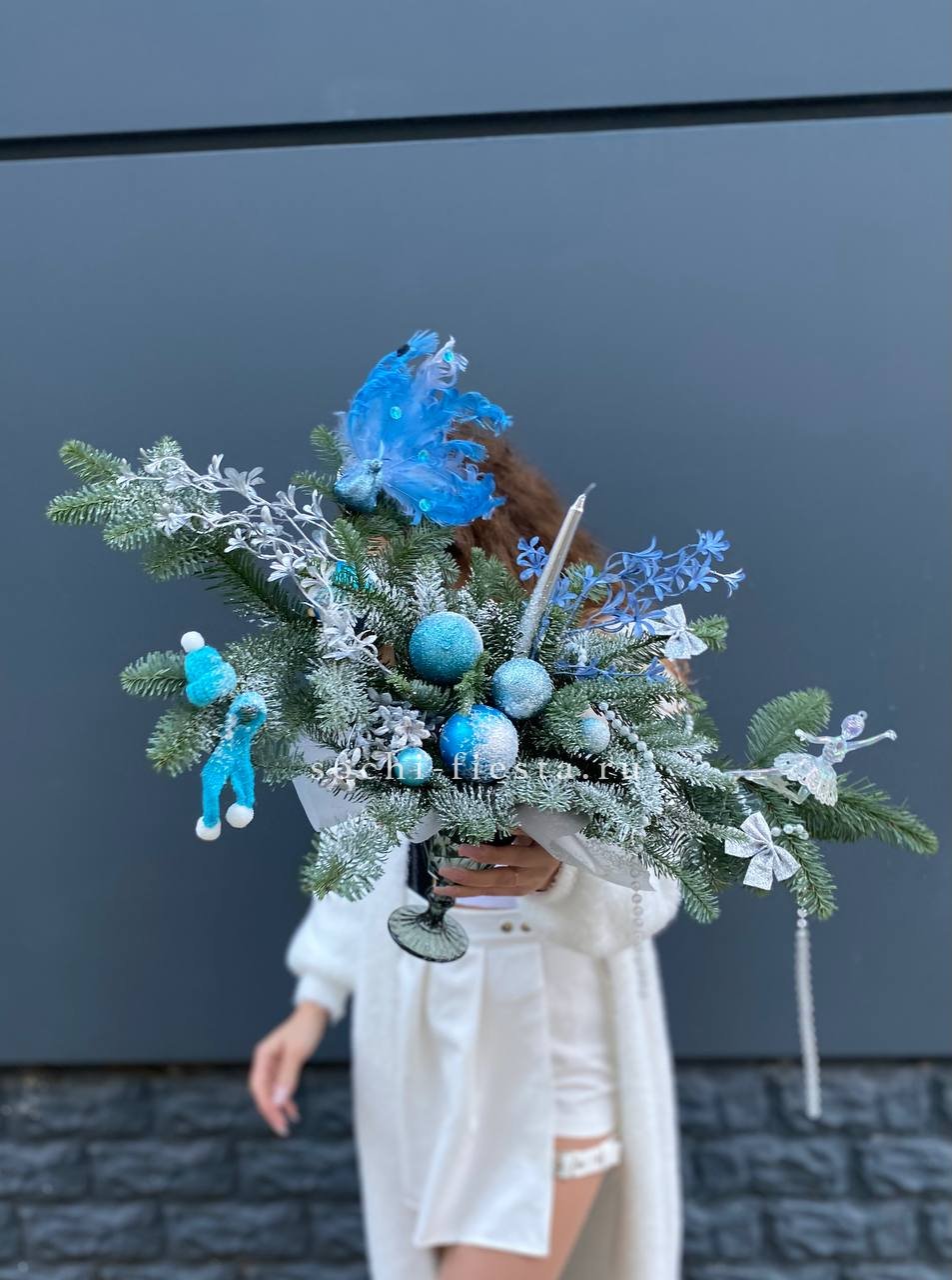 Голубые оттенки декора в сочетании с зеленью нобилиса раскрывают морозную палитру зимы. Свеча в прозрачном бокале добавляет лёгкости и света небольшой настольной форме.