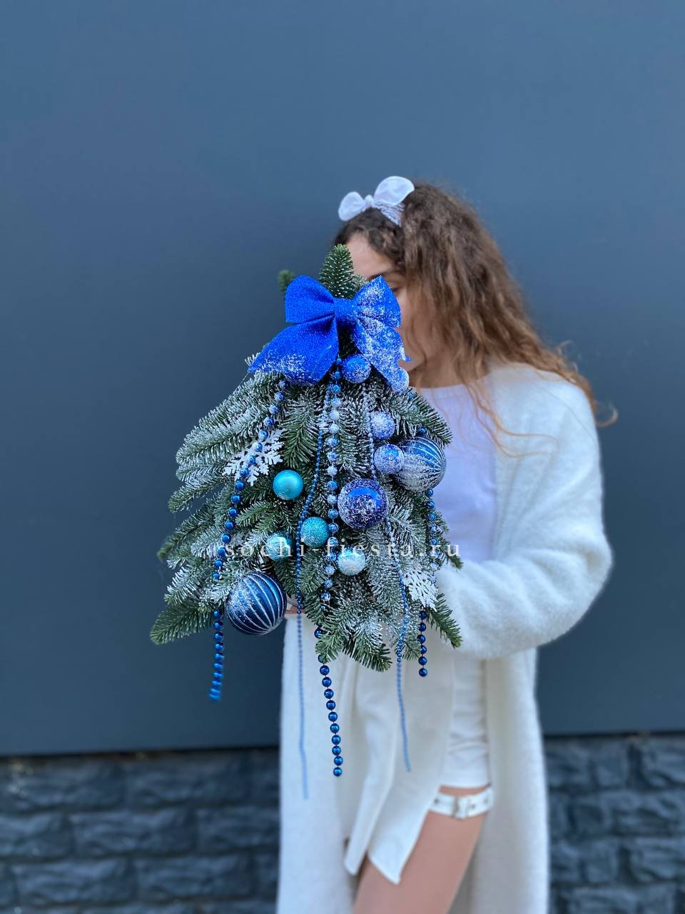 Пушистые ветви датского нобилиса собраны в плотную форму конуса и украшены россыпью бус с праздничными игрушками. Композиция держит силуэт и наполняет комнату свежим хвойным ароматом.