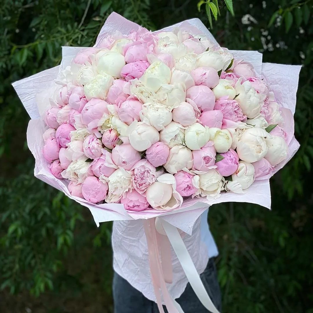 Сто один пион сортов Сара Бернар и Дюшес создают монументальную композицию с мощным присутствием. Бутоны разной степени раскрытости формируют живую текстуру. Такой букет становится центром любого пространства.