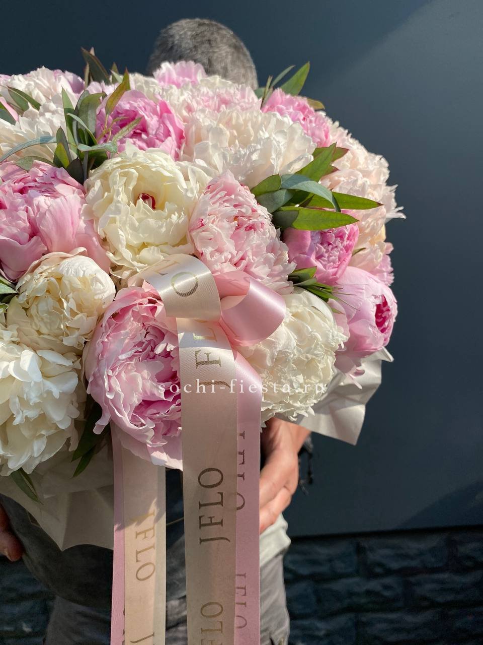 Пятьдесят один пион в бархатном боксе создаёт впечатляющий объём и наполняет пространство. Плотная укладка бутонов формирует цветочное полотно с глубиной и текстурой.