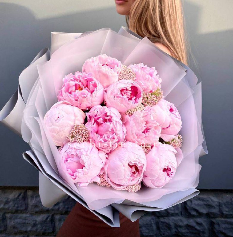 розовые пионы, озатамус, лента, дизайнерская упаковка.