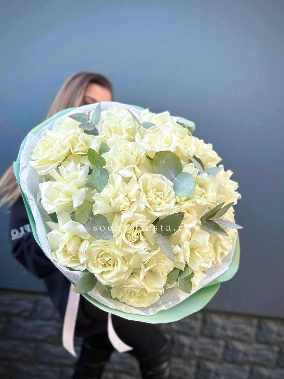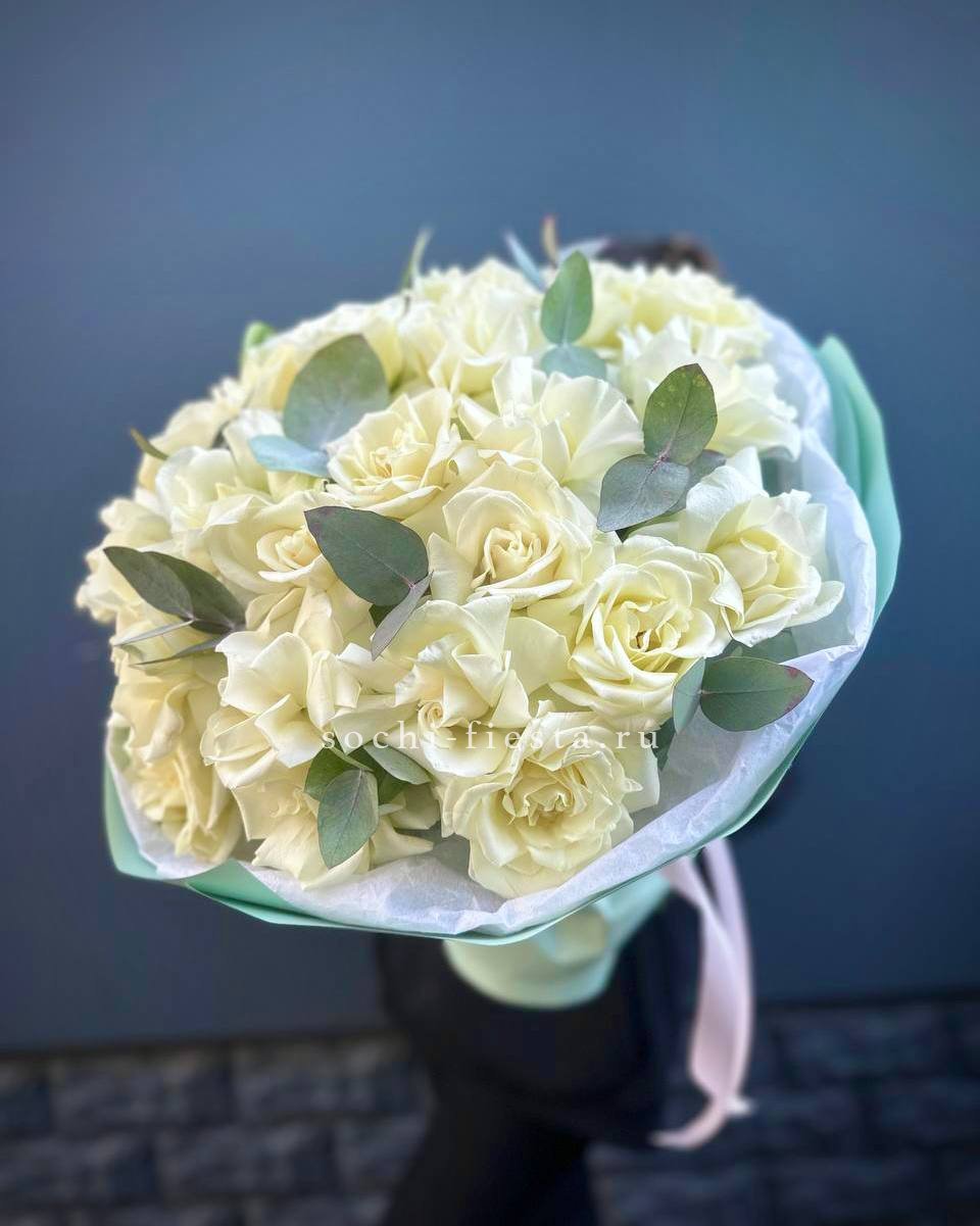 Французские розы Notte Bianca раскрываются широкими вывернутыми бутонами с фактурной глубиной. Эвкалипт добавляет графичности и подчёркивает архитектуру каждого цветка.