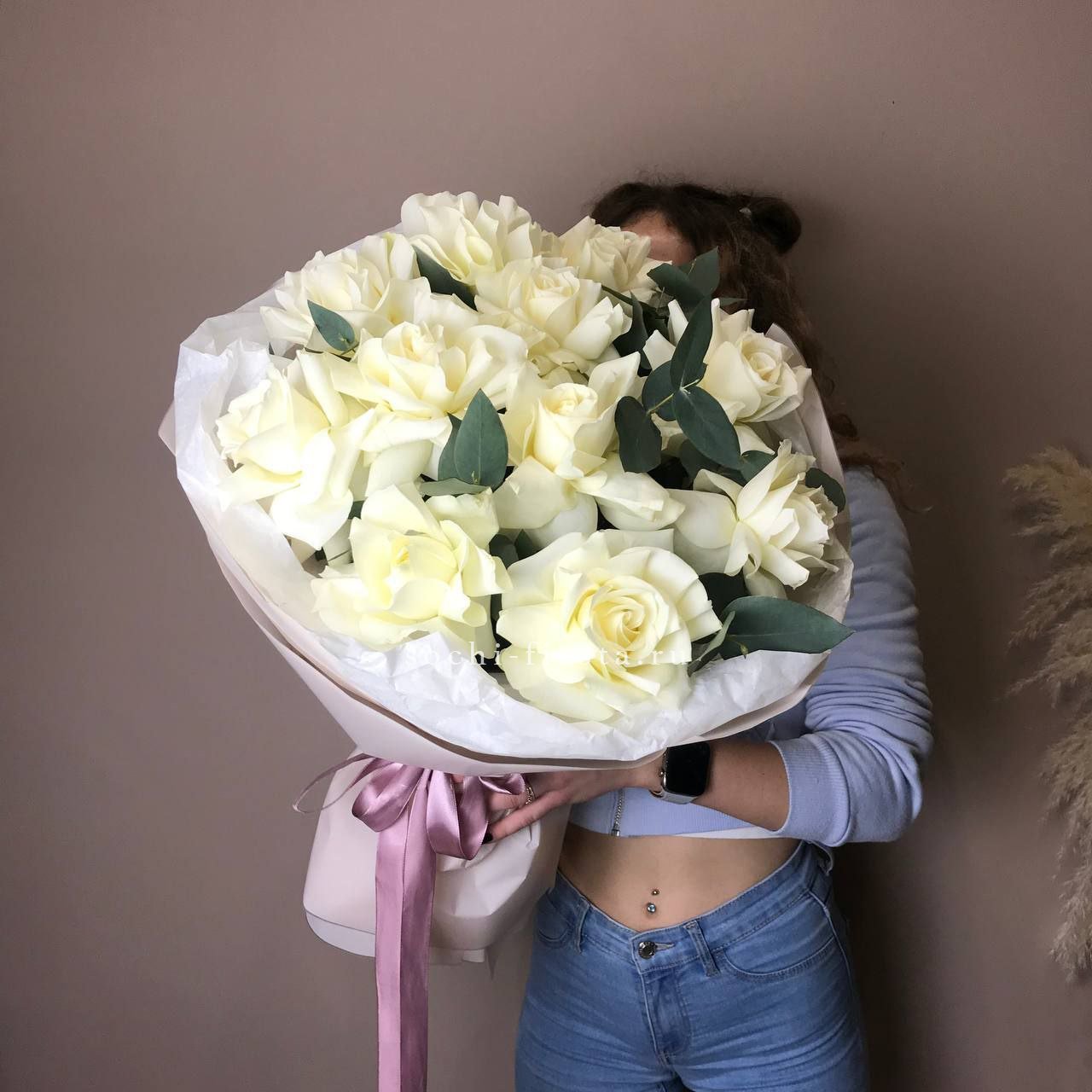 Тридцать один белоснежный бутон собран в плотную округлую форму и дополнен серебристыми ветками эвкалипта. Белый крафт сохраняет природную графику композиции и подчёркивает её объём.