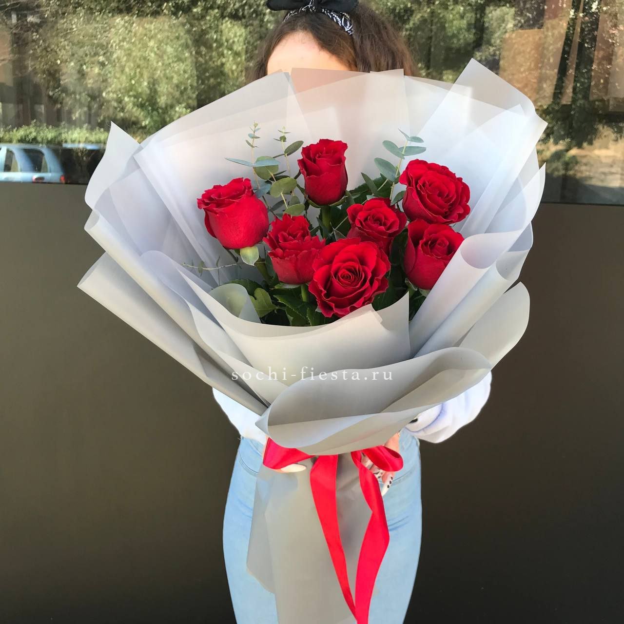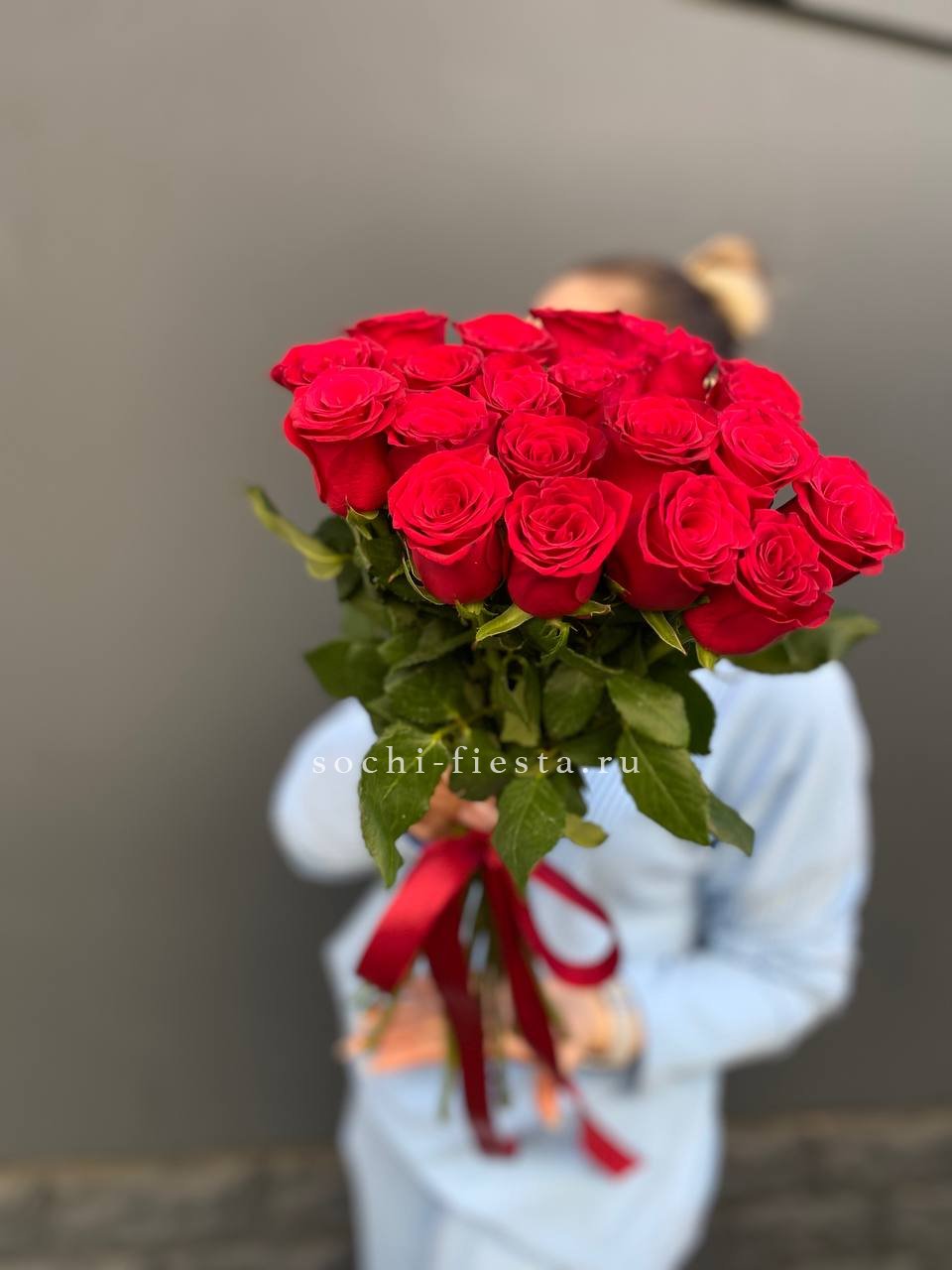 19 алых роз под ленту.