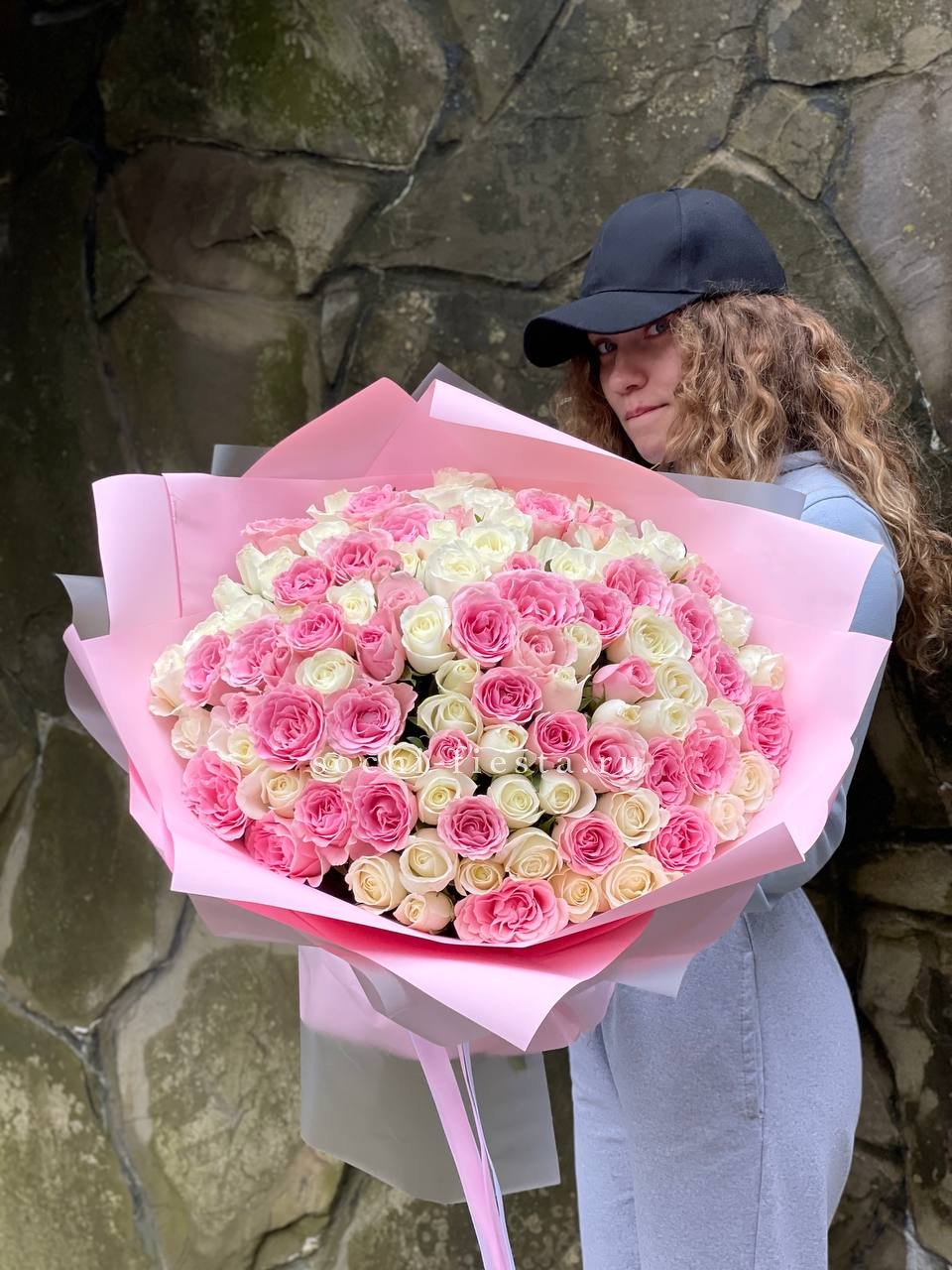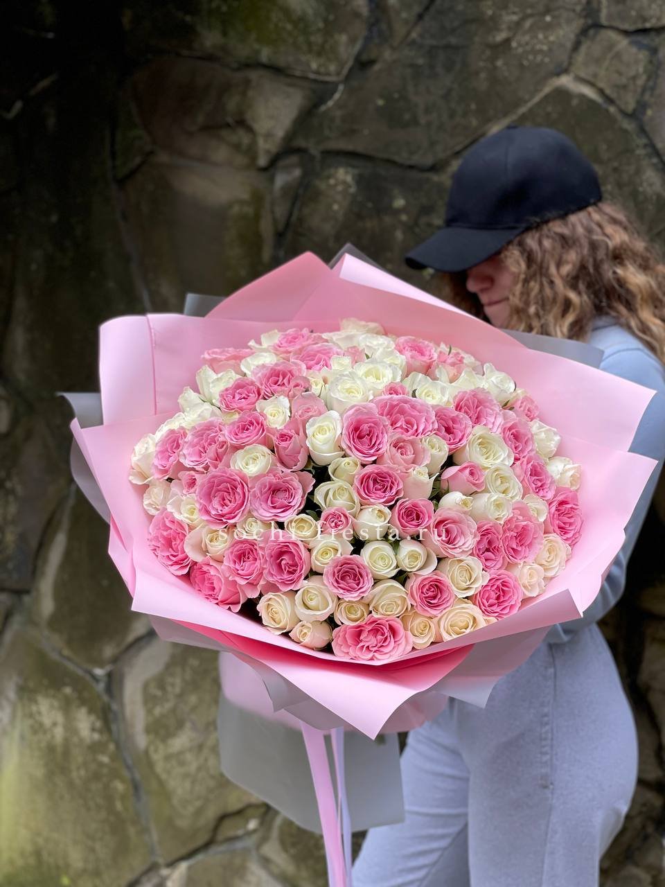 Мягкая игра оттенков между белым и розовым создает объемную глубину букета. Пятьдесят один бутон выстраивается в плотную структуру, где каждый цвет усиливает звучание соседнего без резких границ.