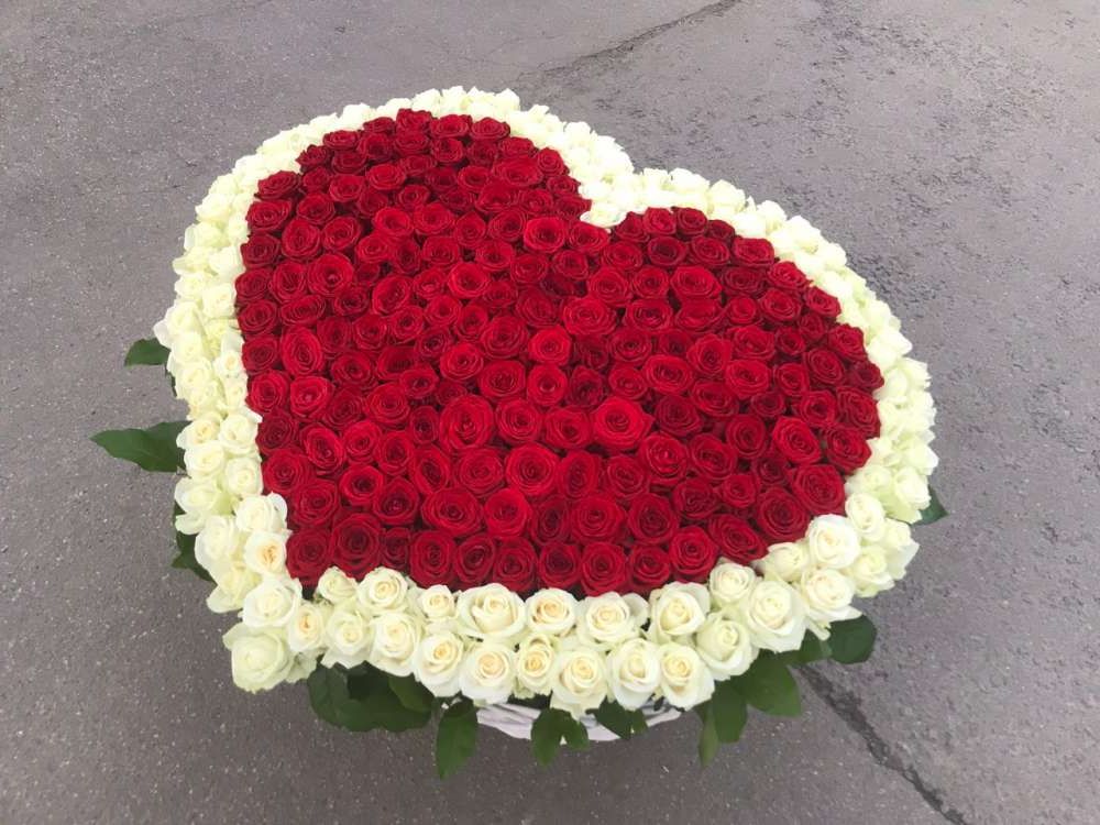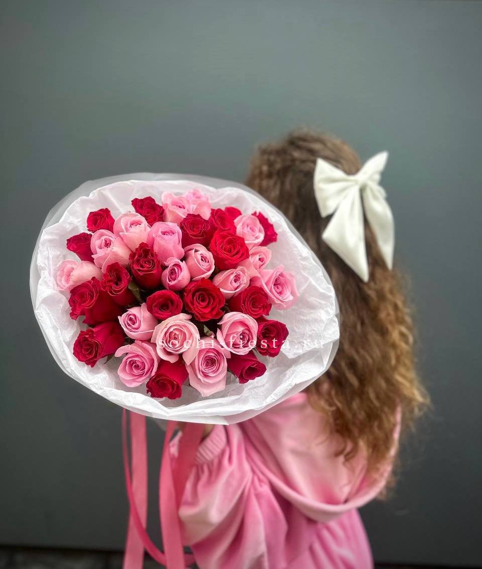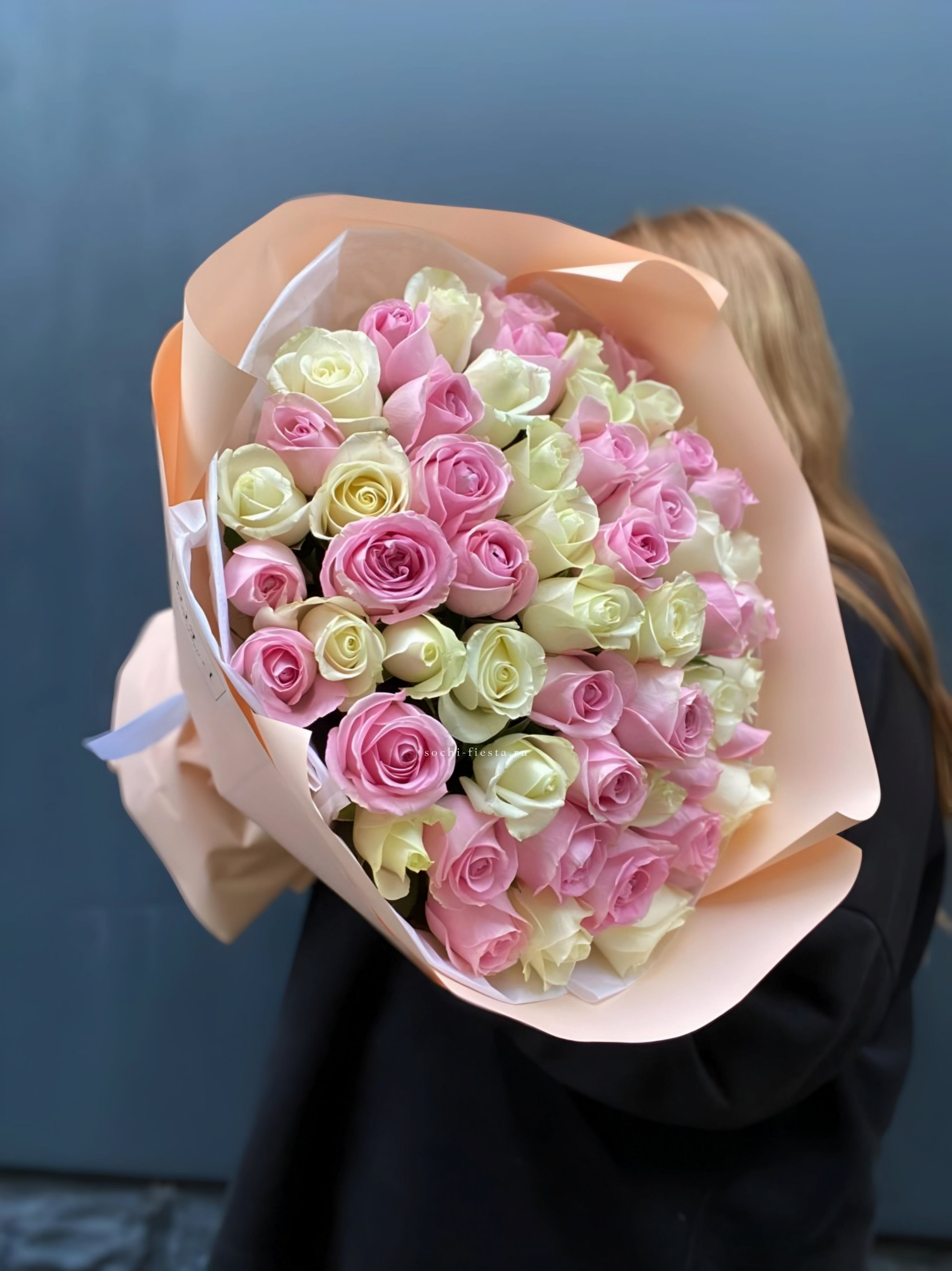55 роз белого и розового оттенков или же с добавлением кремовой розы, лента, упаковка.