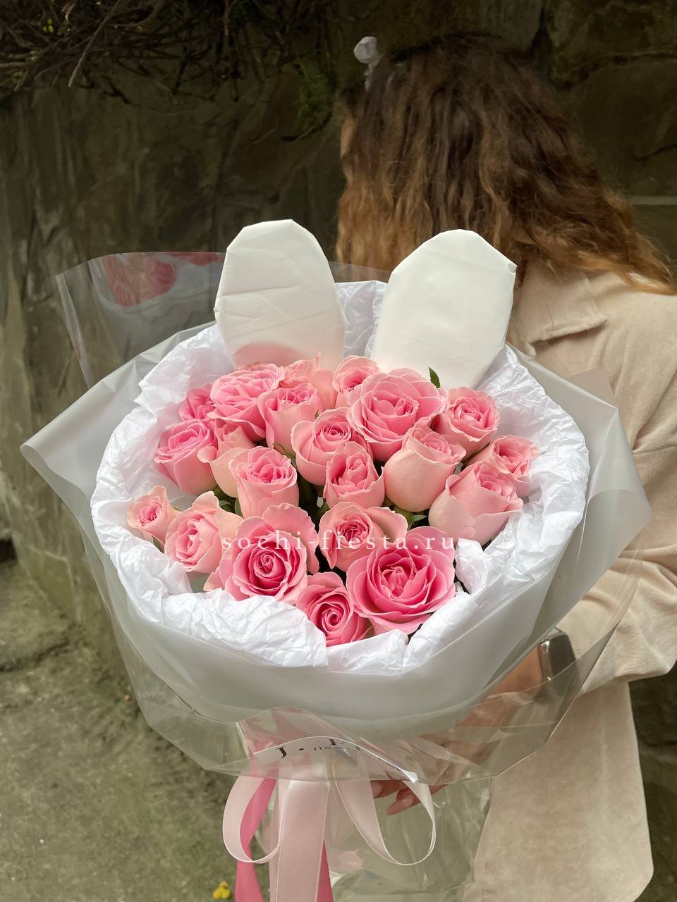 Двадцать одна роза в оригинальной упаковке с игривыми ушками создает настроение легкости и свежести. Розовые бутоны собраны в аккуратную композицию, которая удерживает форму и выглядит выразительно в любом интерьере.