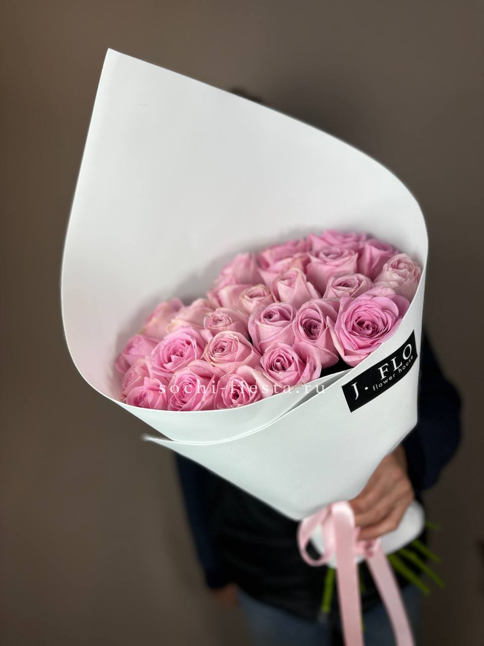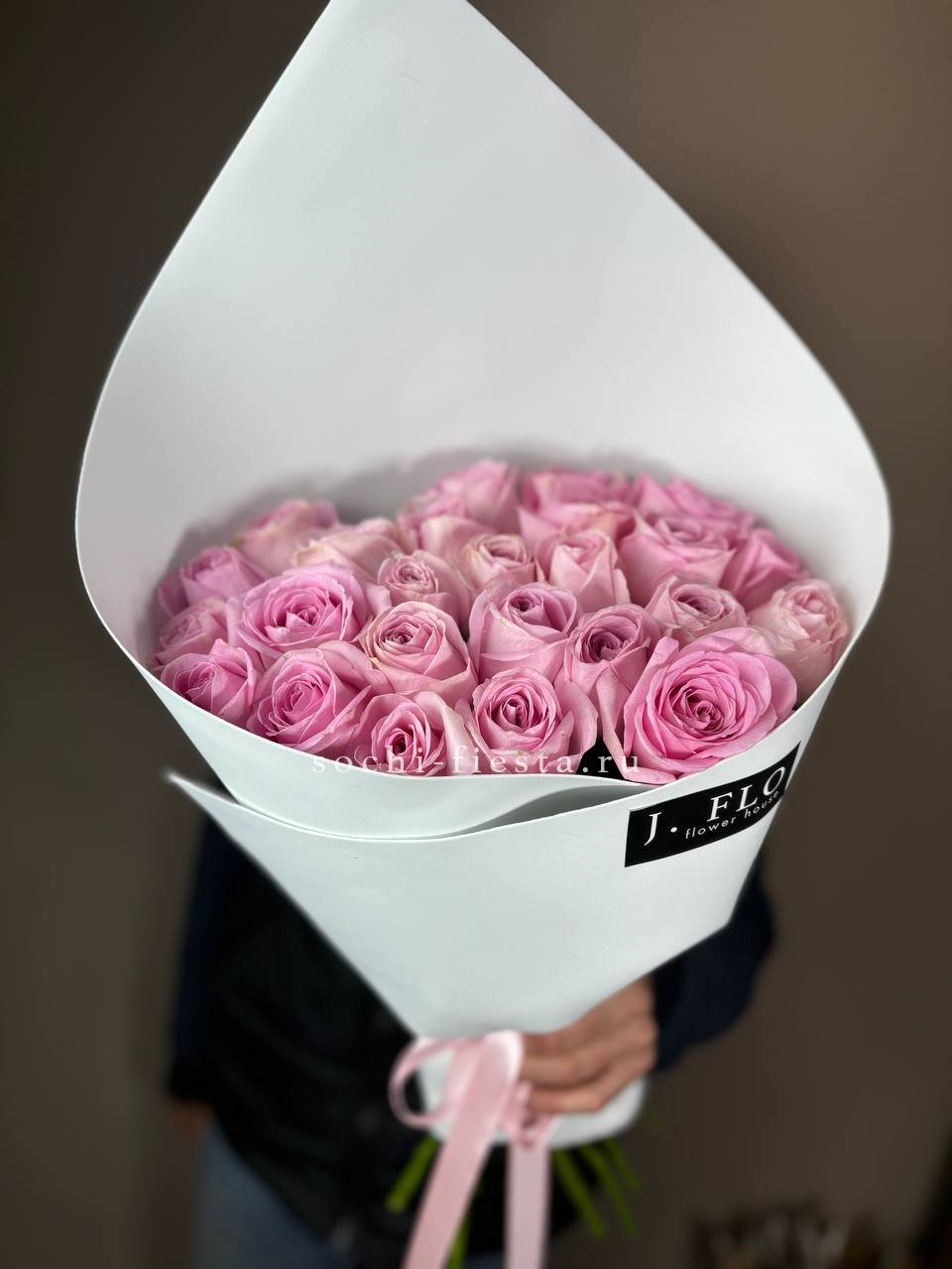 розовая роза 21шт., авторская упаковка с ушками.