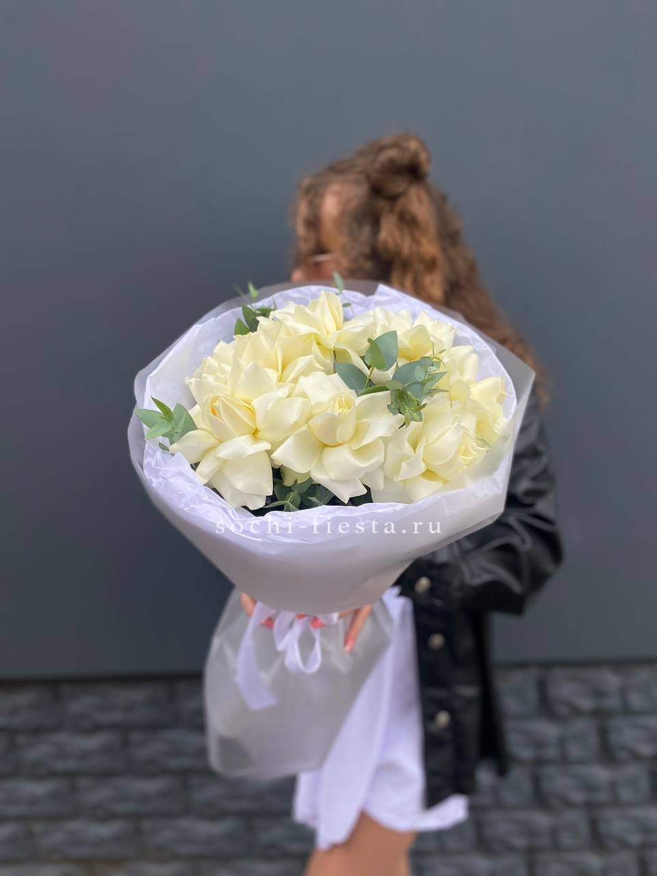 Семь вывернутых бутонов раскрываются широко и свободно, открывая слои белоснежных лепестков. Эвкалипт добавляет воздух и свежесть композиции.