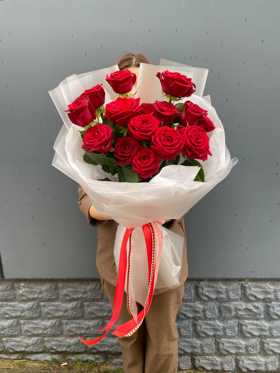 Двадцать пять стеблей выстроены в объёмную композицию с выразительным присутствием. Авторское оформление добавляет завершённость и подчёркивает масштаб букета.