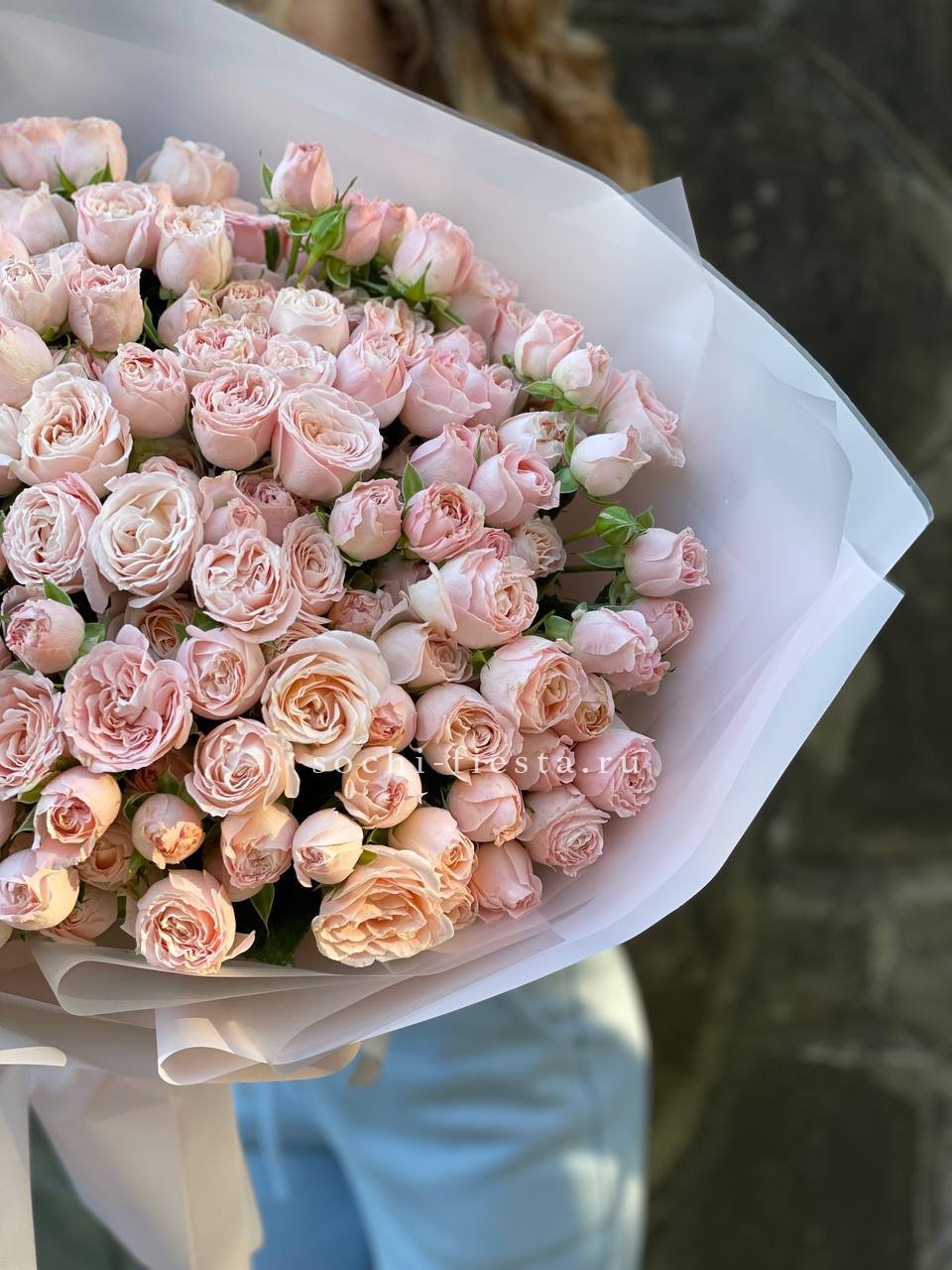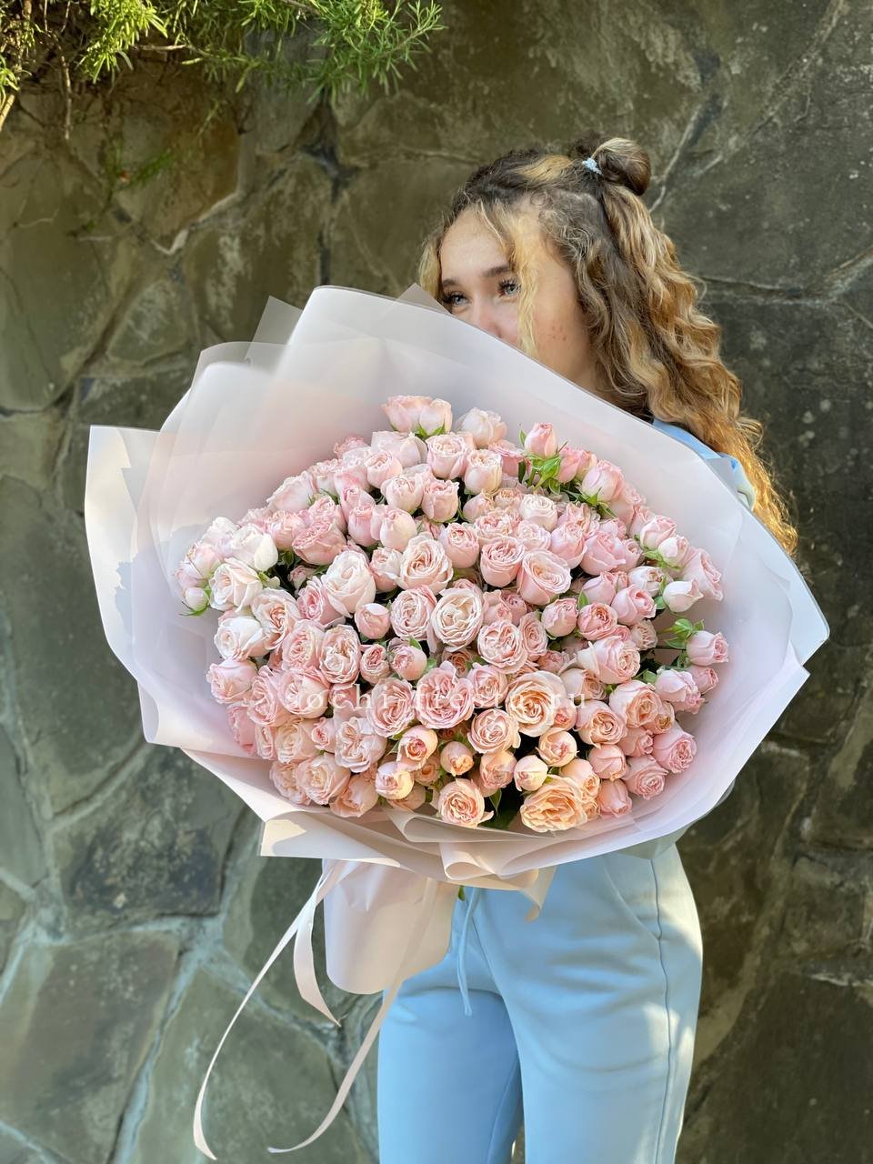 Двадцать пять кустовых роз Бомбастик собраны в пышную композицию с выраженной округлой формой. Плотные многолепестковые бутоны располагаются близко друг к другу, создавая насыщенный визуальный ритм и объемную структуру букета.