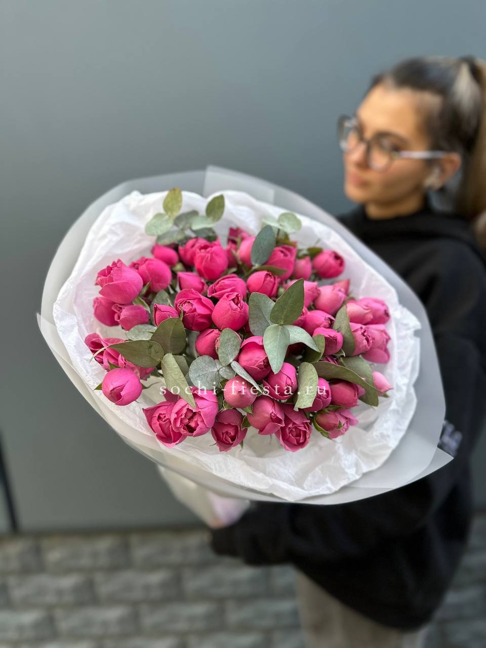 101 пионовидная кустовая кустовая роза Мисти Баблс, лента, дизайнерская упаковка.