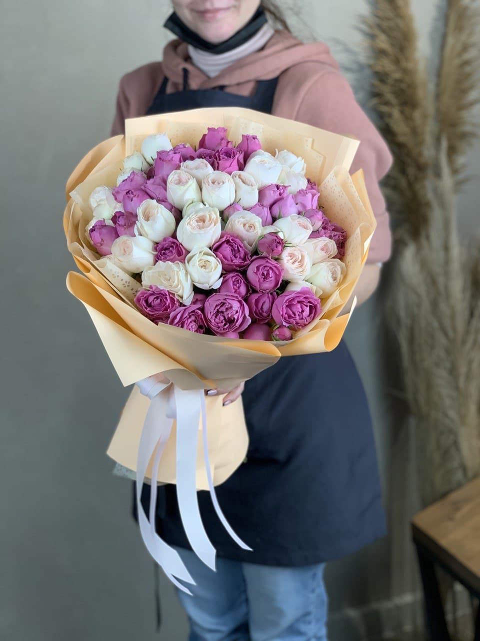 Воздушная композиция из кустовых роз с множеством бутонов на каждой ветке. Пионовидная структура цветков добавляет объем и создает впечатление цветущего облака в руках.