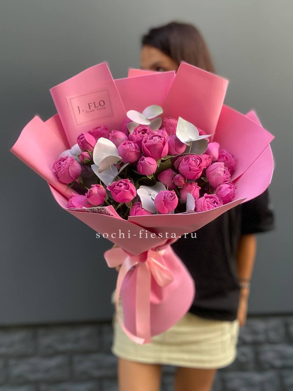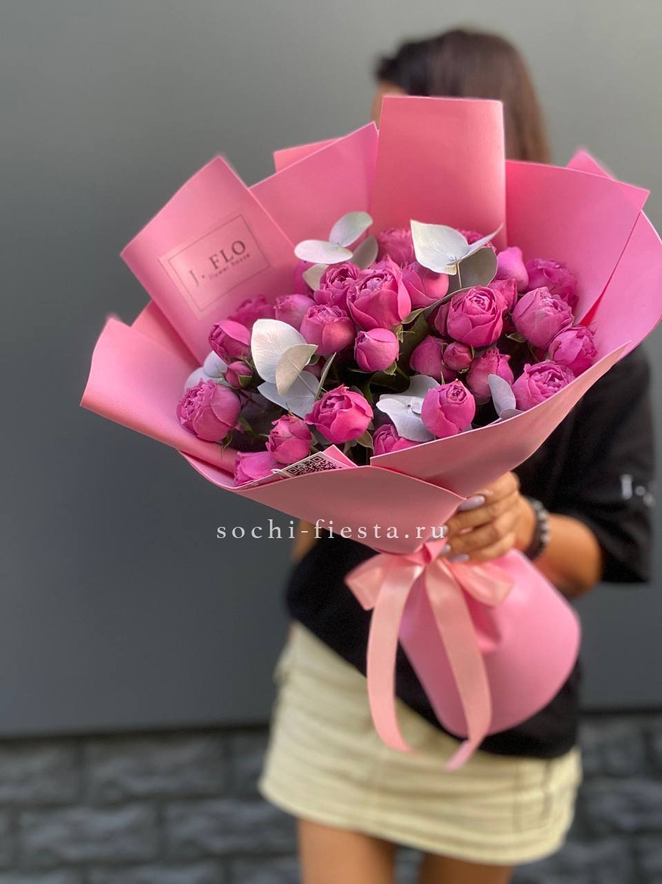 Пятнадцать бутонов Мисти Бабблс с лавандовым отливом и припыленной текстурой лепестков. Компактная форма и сдержанная гамма создают ощущение утренней свежести.