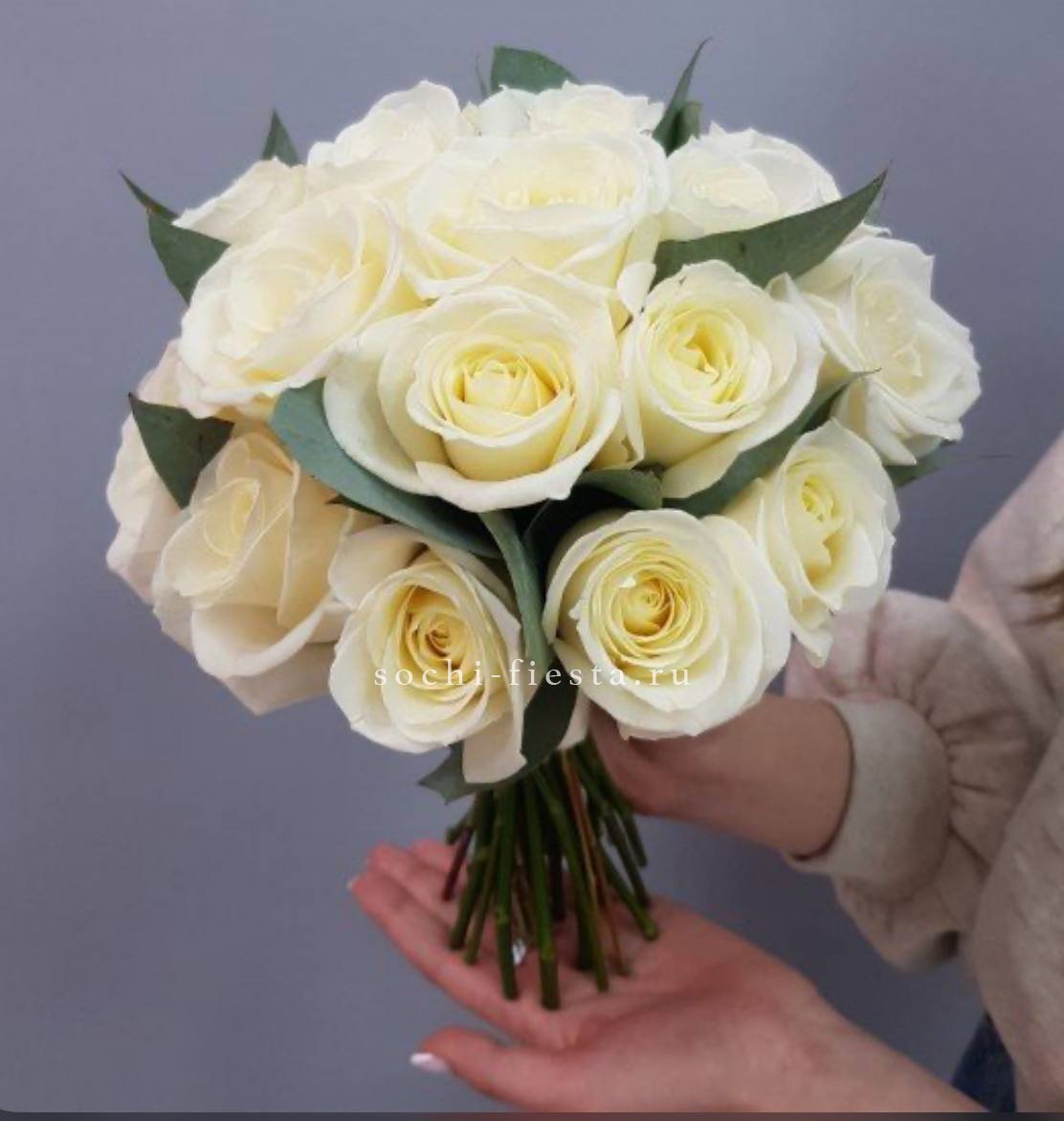 эустома, белые одноголовые розы, пионовидные кустовые кремовые розы Бомбастик, эвкалипт, лента, дизайнерская пленка комбинированная.