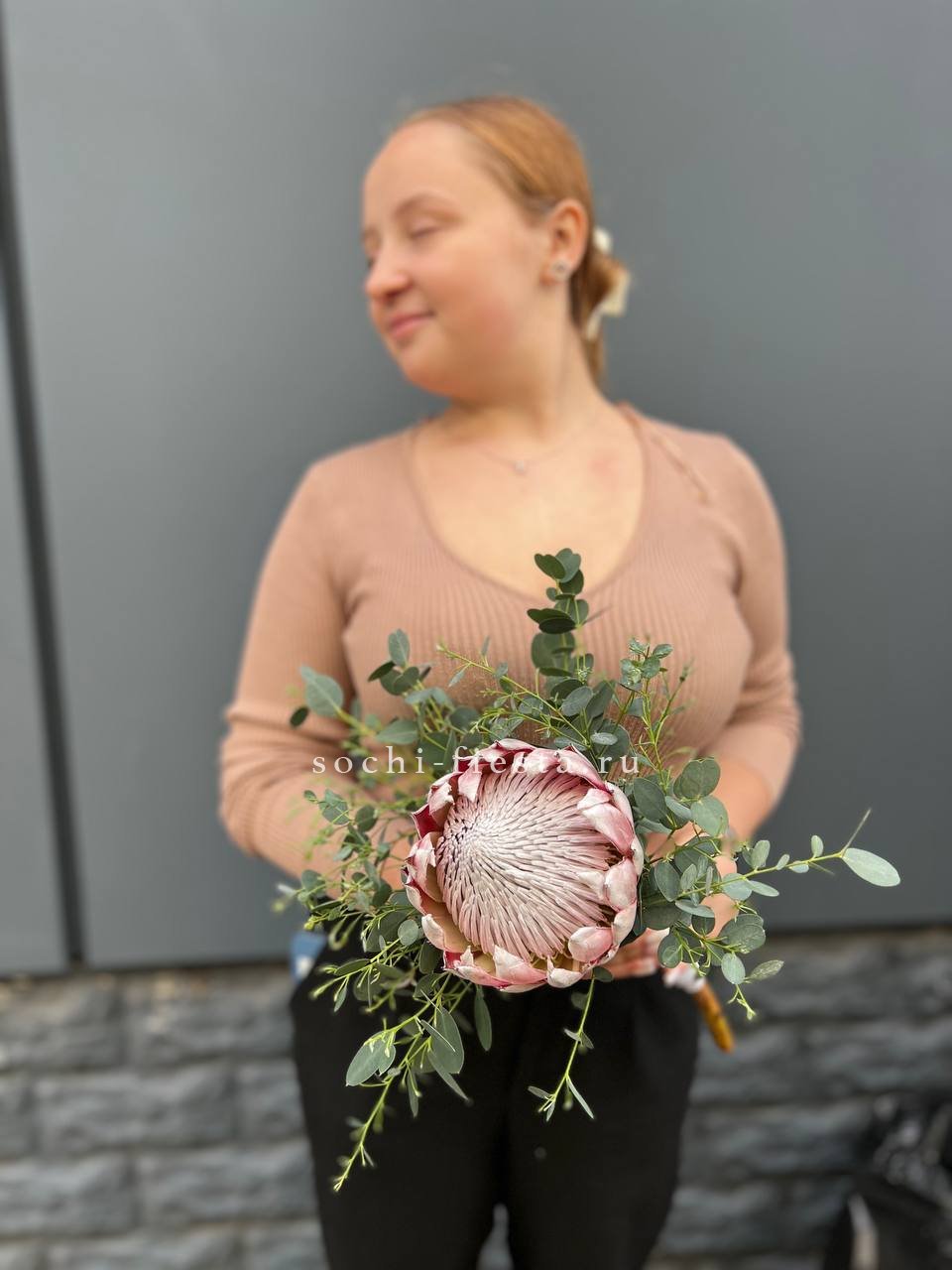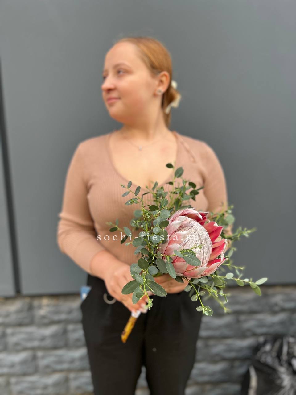 Крупные соцветия протеи создают графичную композицию с чёткими линиями и природной архитектурой. Ветки эвкалипта добавляют воздушности и завершают форму. Букет для церемонии в естественной стилистике.