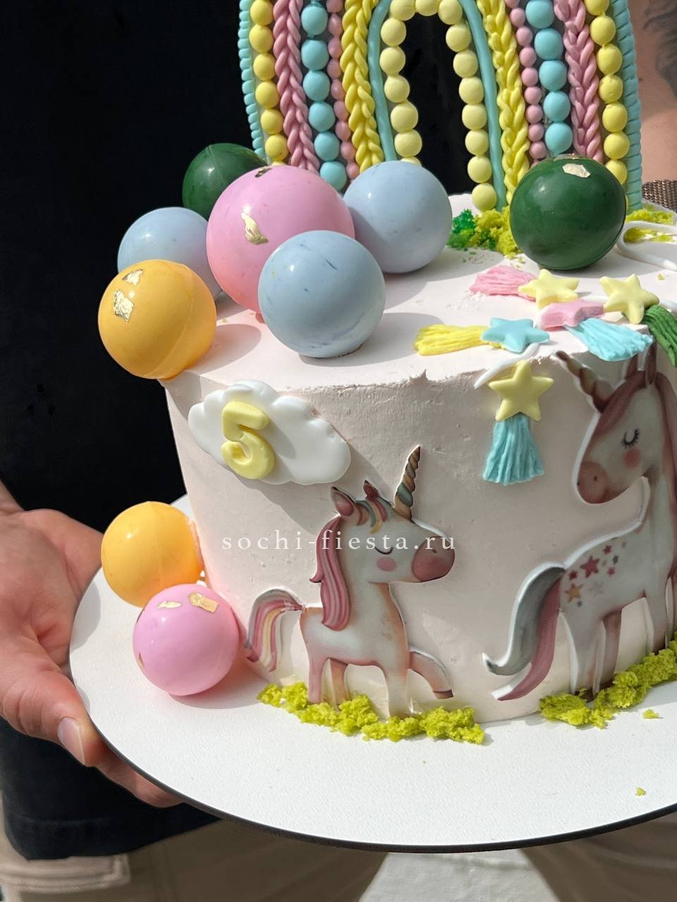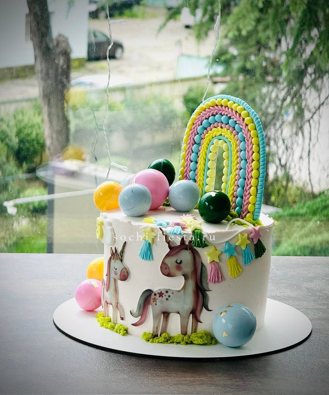 Яркие слои бисквита и крема образуют радужный градиент, а сверху композицию завершает фигурка единорога. Каждый ярус раскрывает новый вкус, превращая угощение в красочное приключение для именинника и гостей.